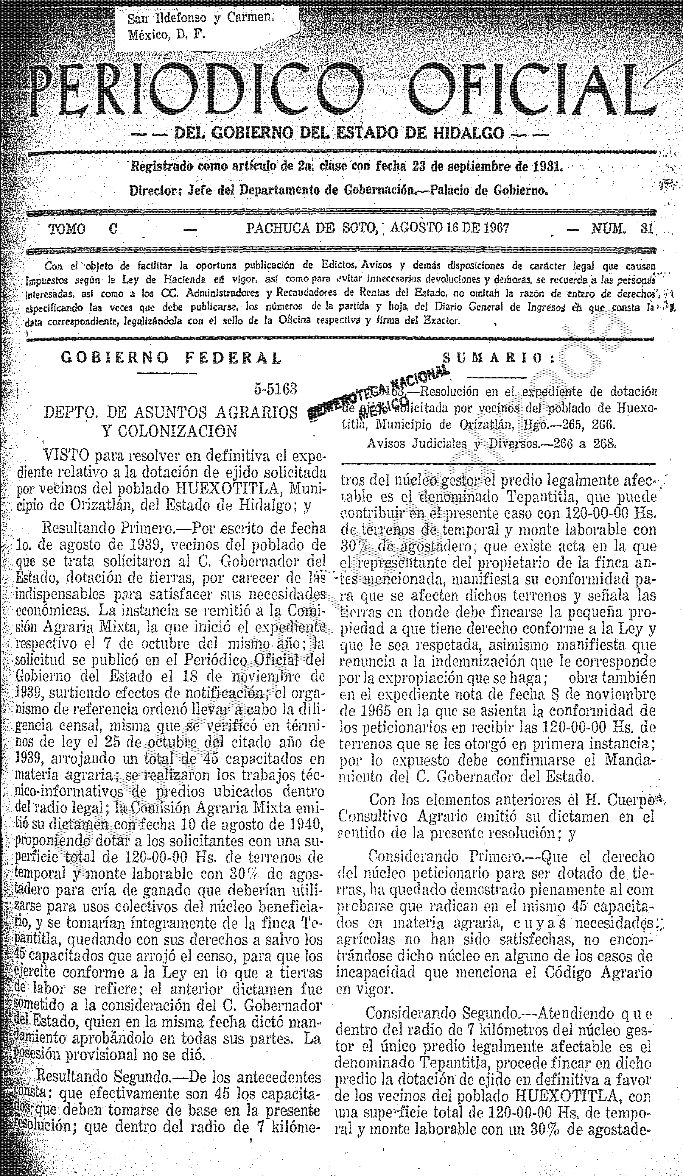 - 5-5163.- Resolución en el expediente de dotación de ejido solicitada por vecinos del poblado de Huexotitla, Municipio de Orizatlán, Hgo.