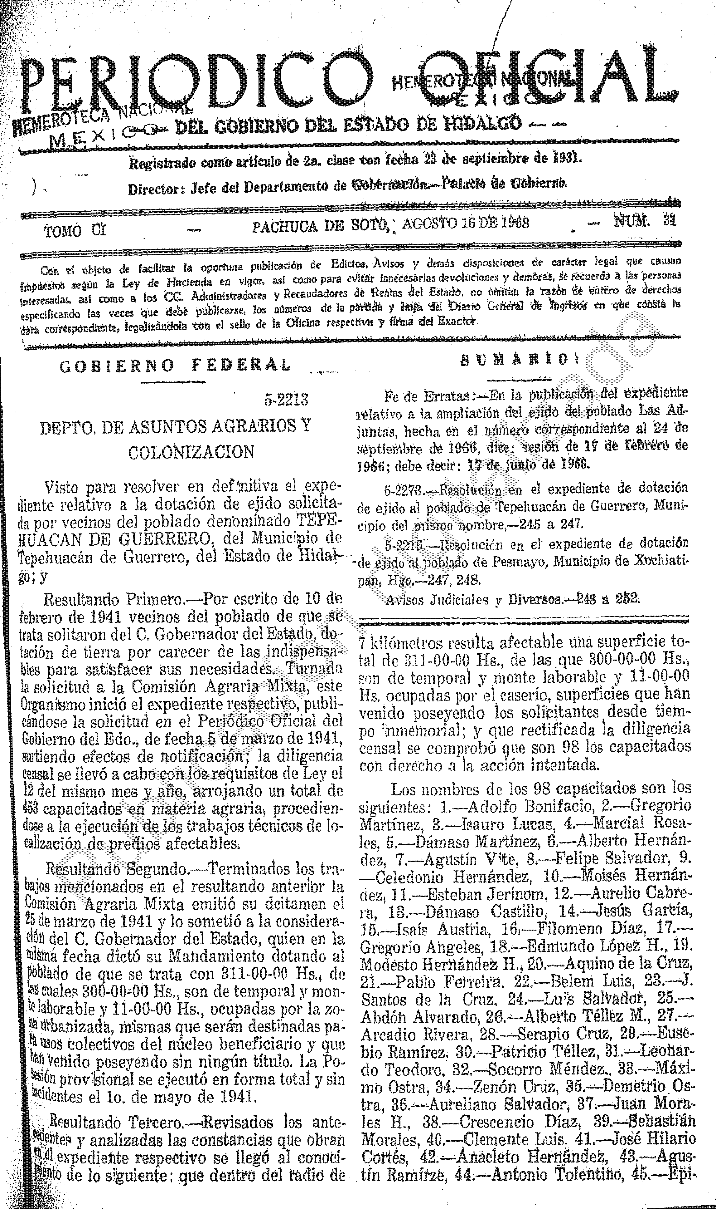 Descargar Periódico Oficial Ordinario 0 del 16 de agosto de 1968