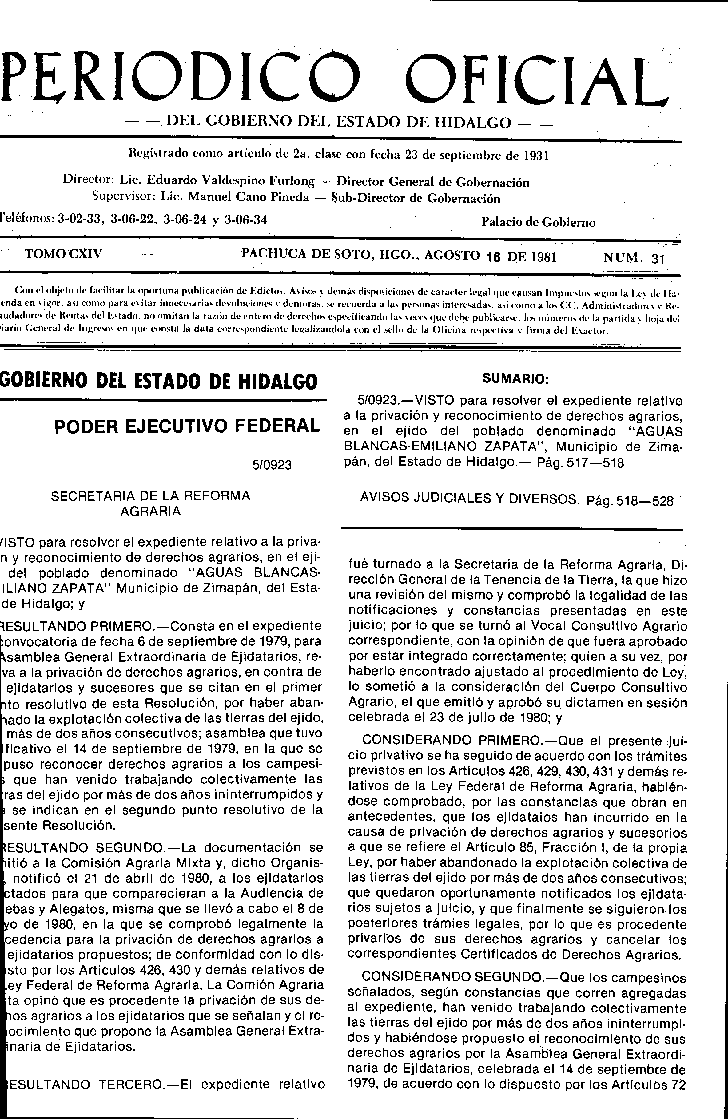 • 5/0923.- VISTO para resolver el expediente relativo a la privación y reconocimiento de derechos agrarios, en el ejido del poblado denominado “AGUAS BLANCAS-EMILIANO ZAPATA”, Municipio de Zimapán, del Estado de Hidalgo.