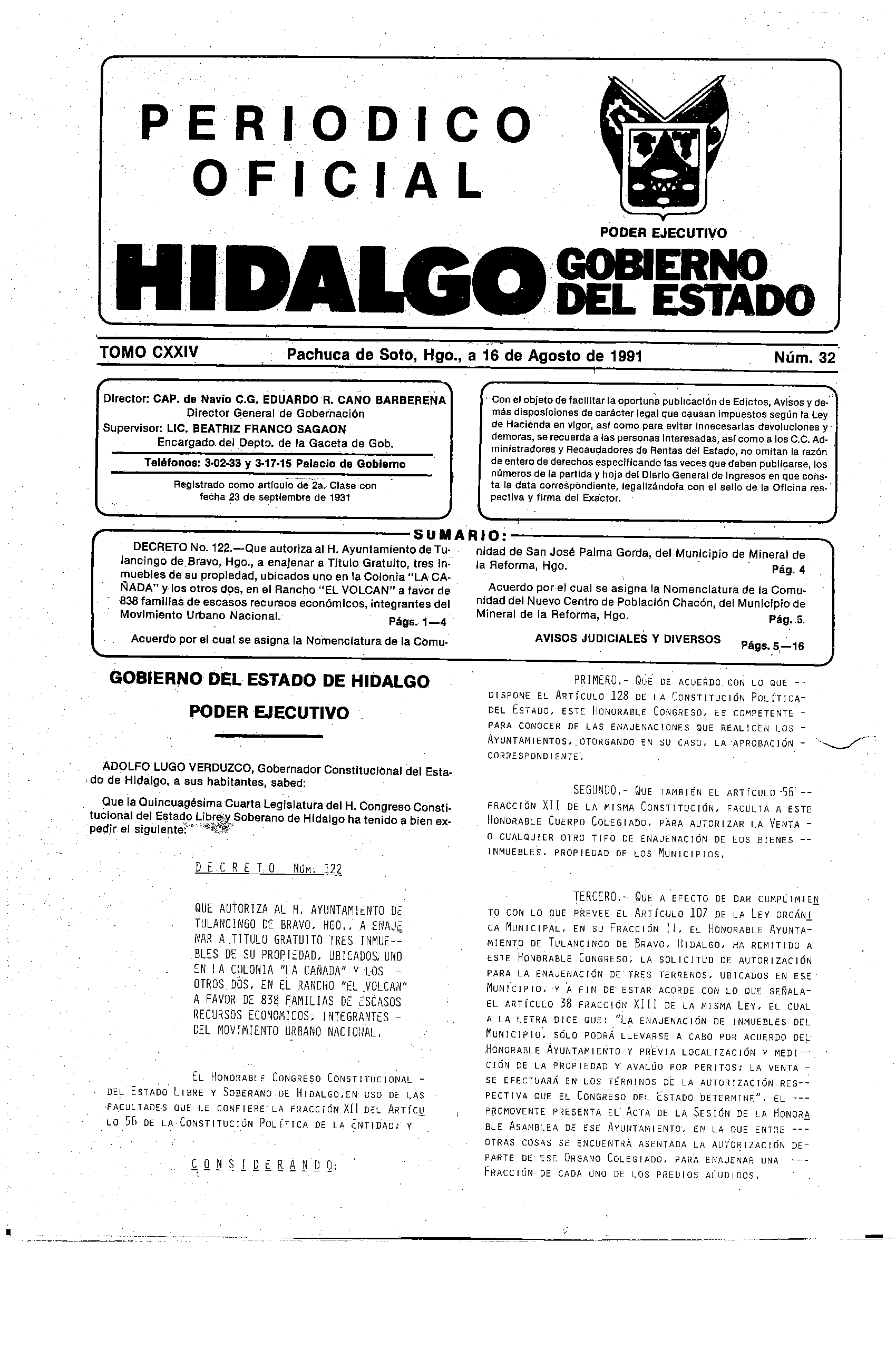 • Decreto No. 122.- Que autoriza al H. Ayuntamiento de Tulancingo de Bravo, Hgo., a enajenar a título Gratuito, tres inmuebles de su propiedad, ubicados uno en la Colonia “LA CAÑADA” y los otros dos, en el Rancho “EL VOLCAN” a favor de 838 familias de escasos recursos económicos, integrantes del Movimiento Urbano Nacional.