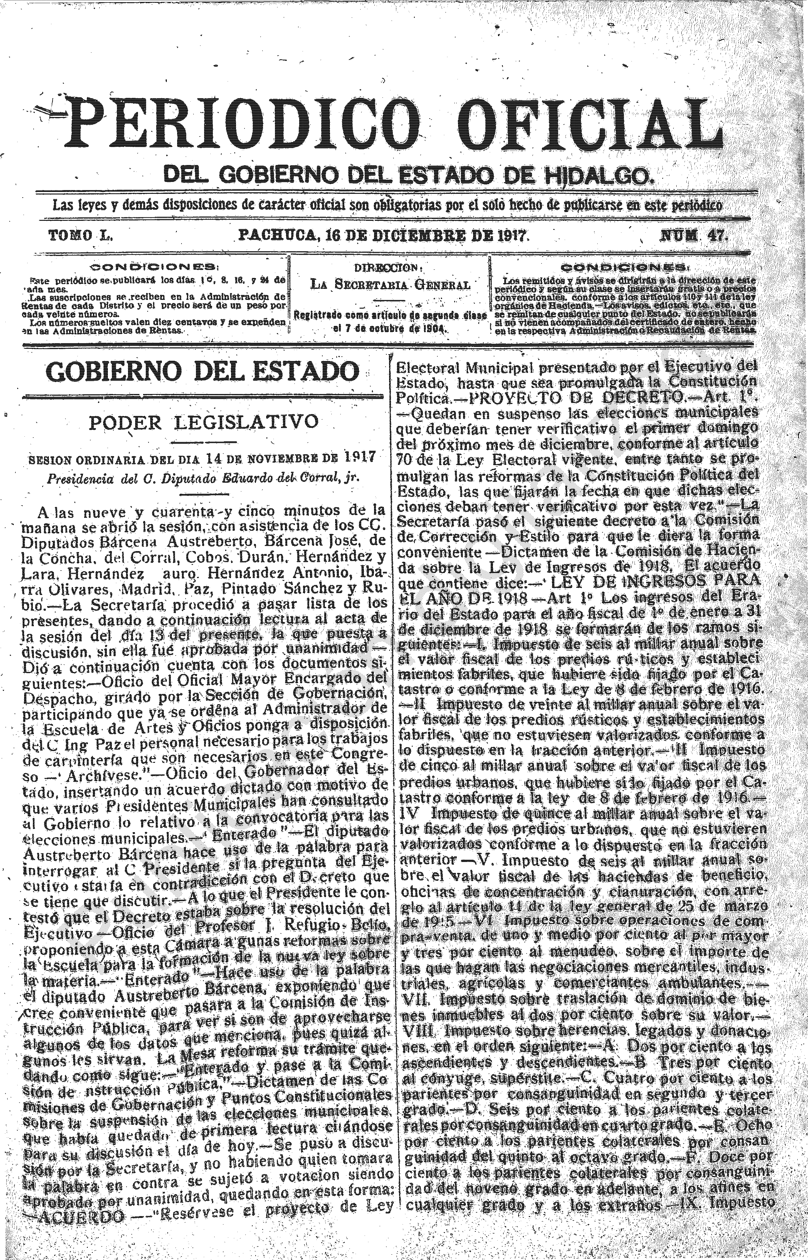 - Poder Legislativo, sesión ordinaria del día 14 de noviembre de 1917.
