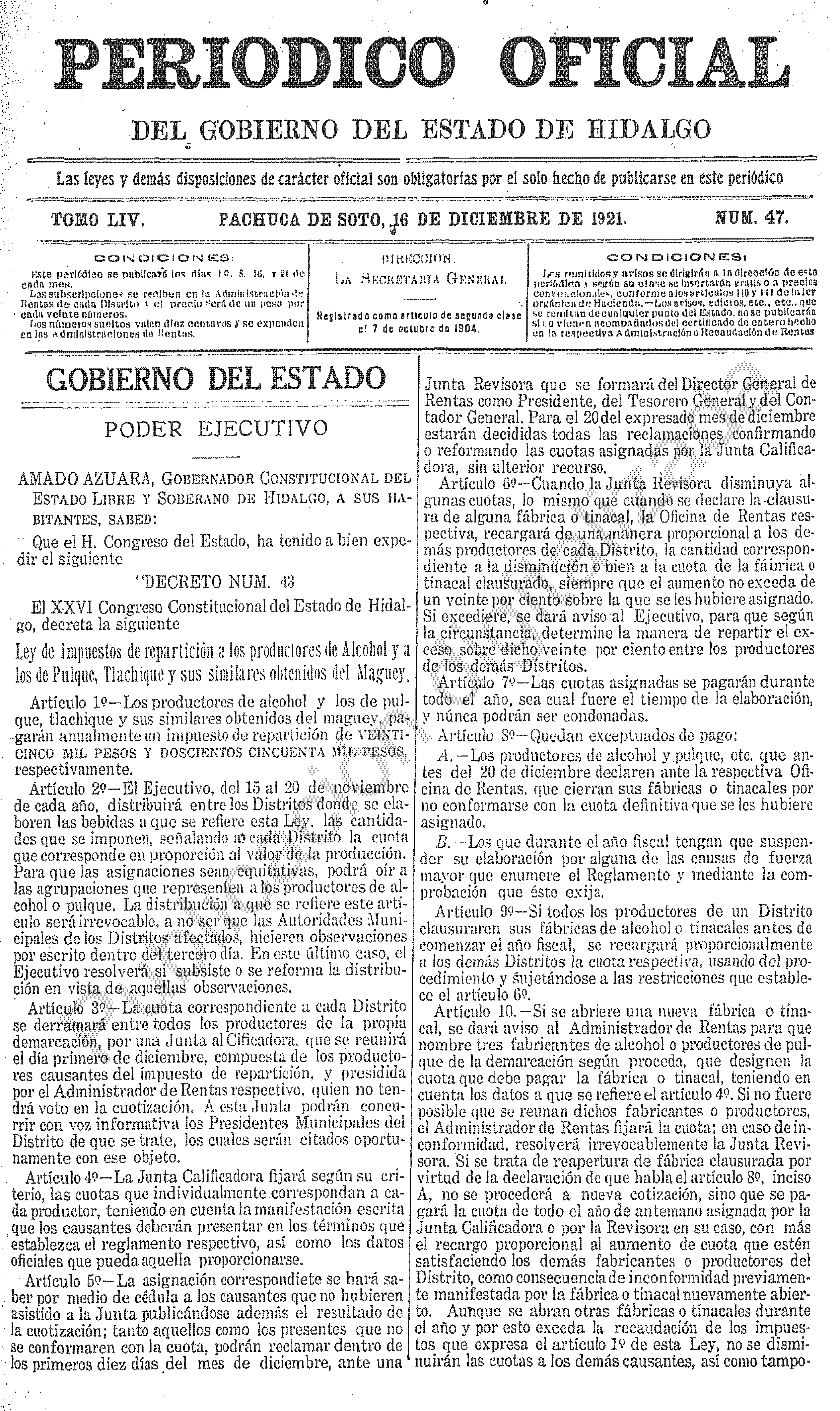 • Poder Ejecutivo, Amado Azuara, Gobernador Constitucional del Estado de Hidalgo, Decreto núm. 43, Ley de impuestos de repetición a los productores de Alcohol y a los de pulque, Tlachique y sus similares obtenidos del Maguey.