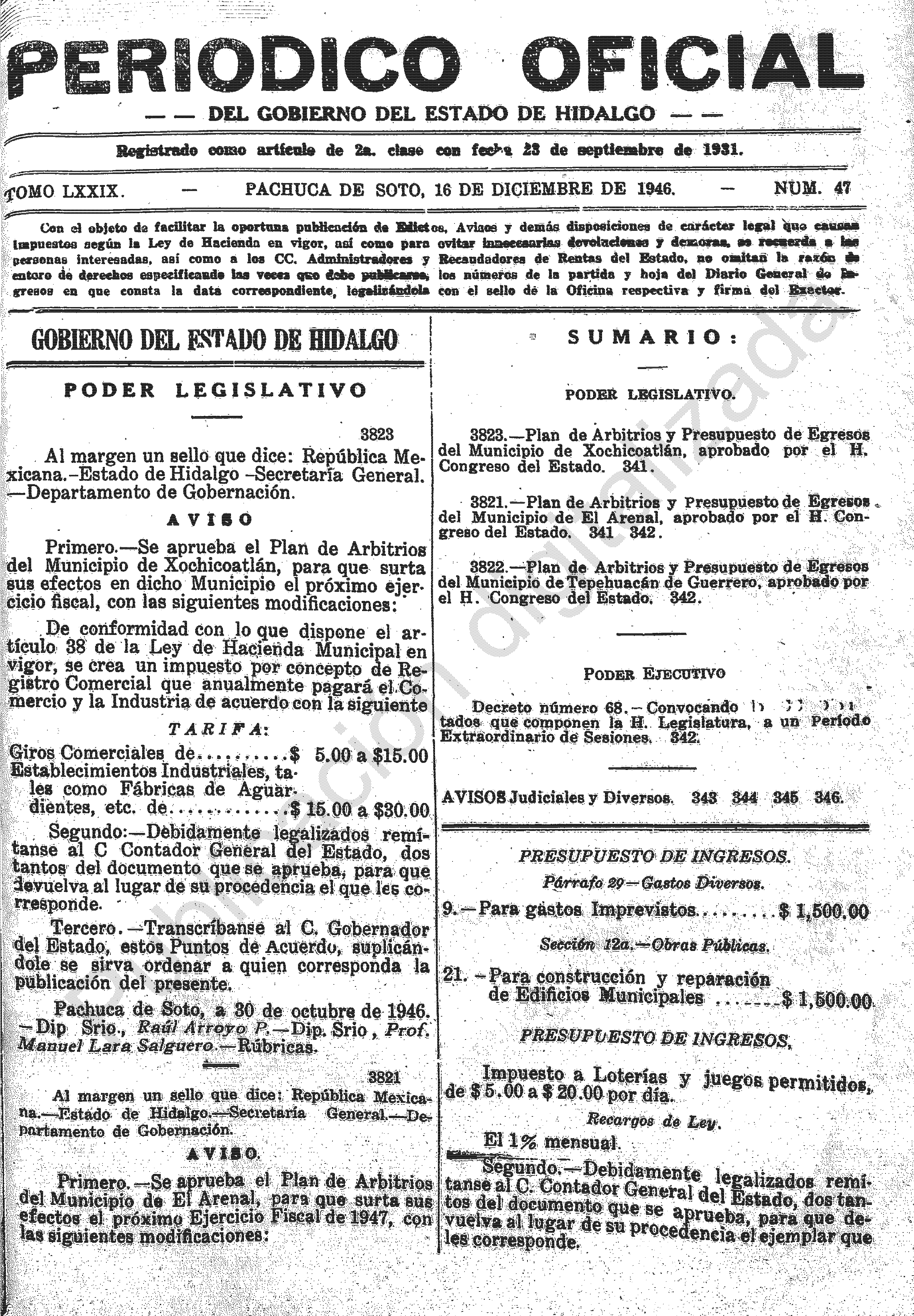 • 3823.- Plan de Arbitrios y Presupuesto de Egresos del Municipio de Xochicoatlán aprobado por el H. Congreso del Estado.
