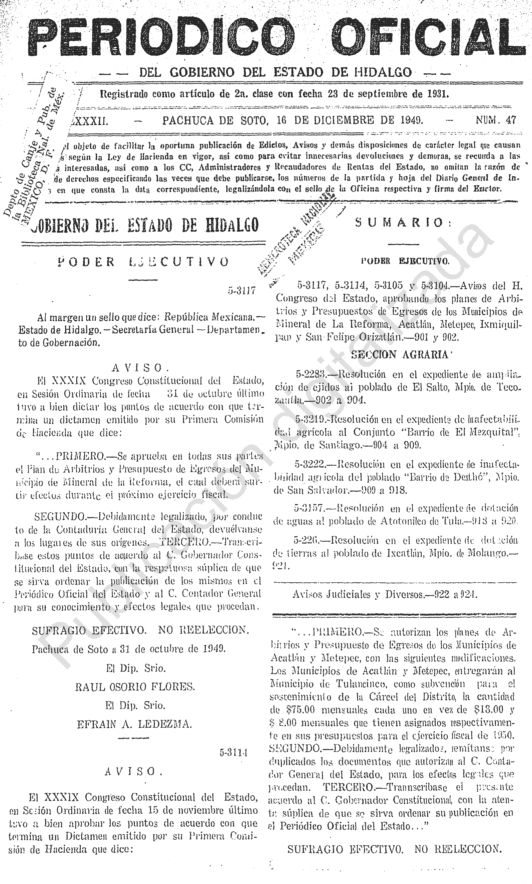 • 5-3117, 5-3114, 5-3105, 5-3104.- Avisos del H. Congreso del Estado, aprobando los planes de Arbitrios y Presupuestos de Egresos de los Municipios de Mineral de La Reforma, Acatlán, Metepec, Ixmiquilpan y San Felipe Orizatlán.