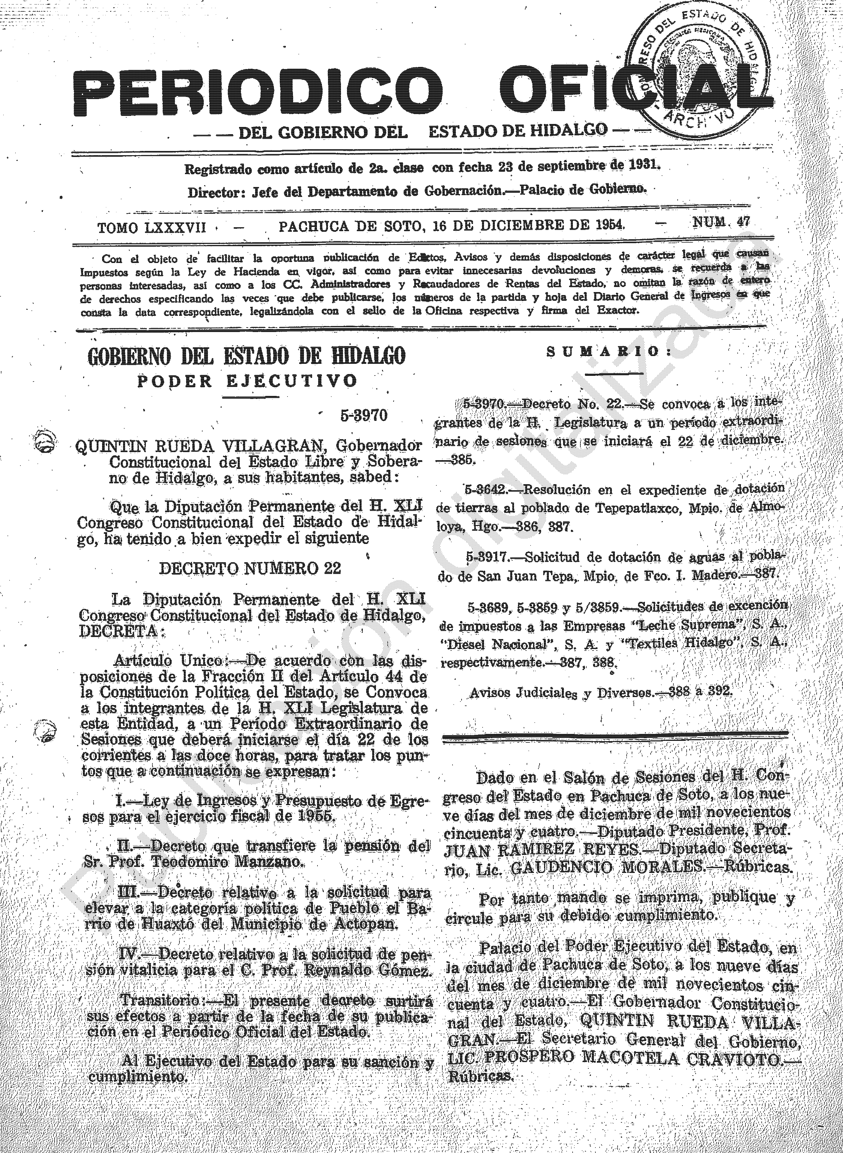 - 5-3970.- Decreto No. 22.- Se convoca a los integrantes de la H. Legislatura a un período extraordinario de sesiones que se iniciará el 11 de Diciembre.