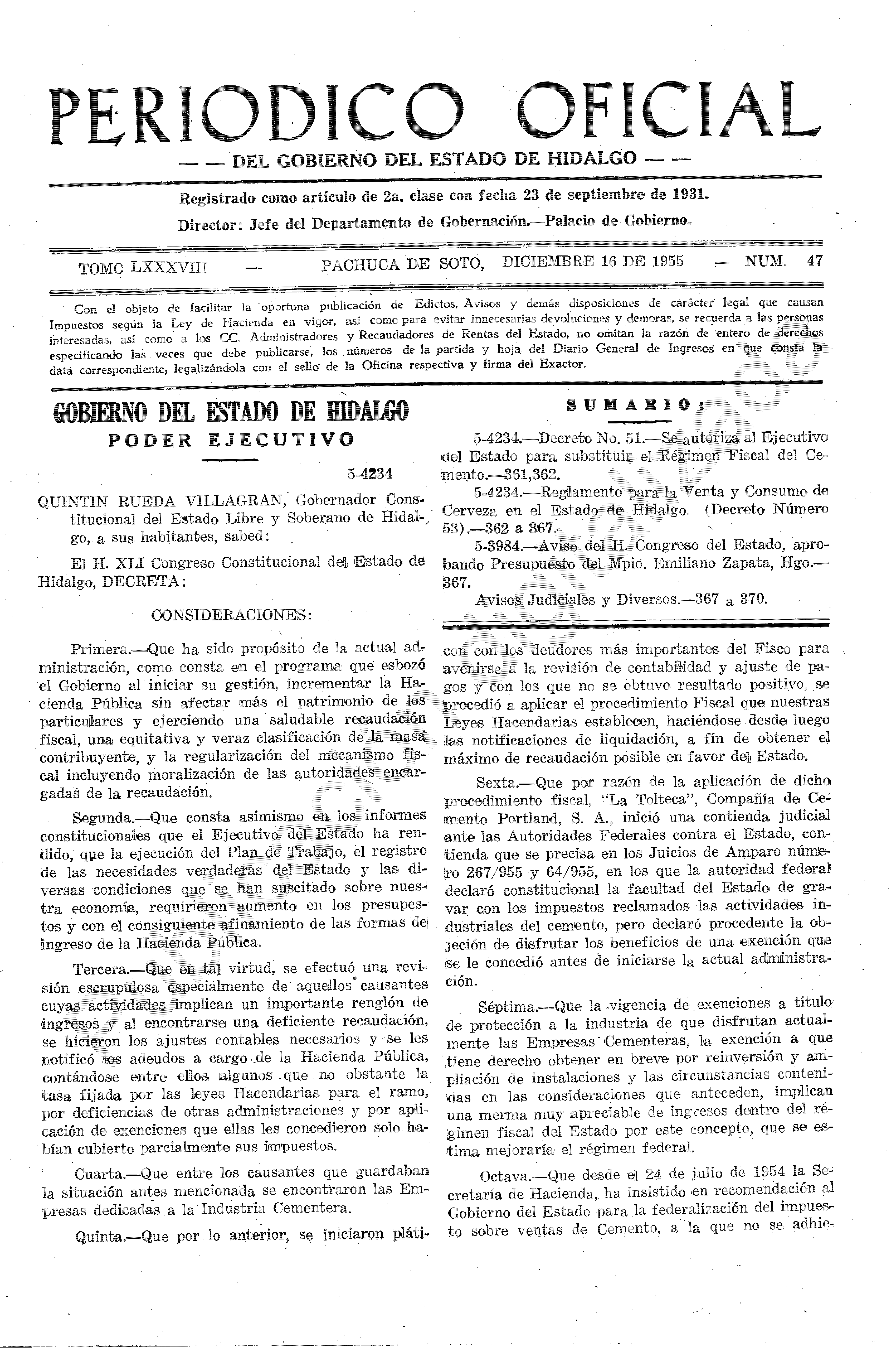 - 5-4234.- Decreto No. 51.- Se autoriza al Ejecutivo del Estado para substituir el Régimen Fiscal del Cemento.