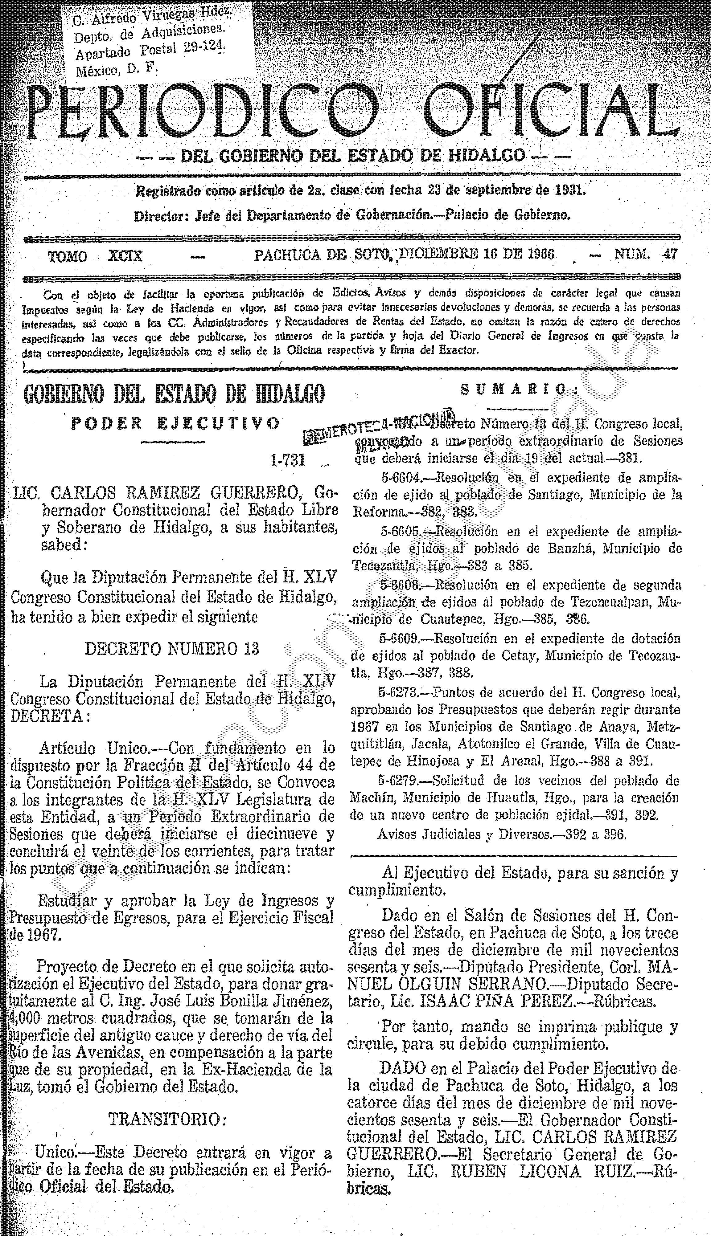 Descargar Periódico Oficial Ordinario 0 del 16 de diciembre de 1966