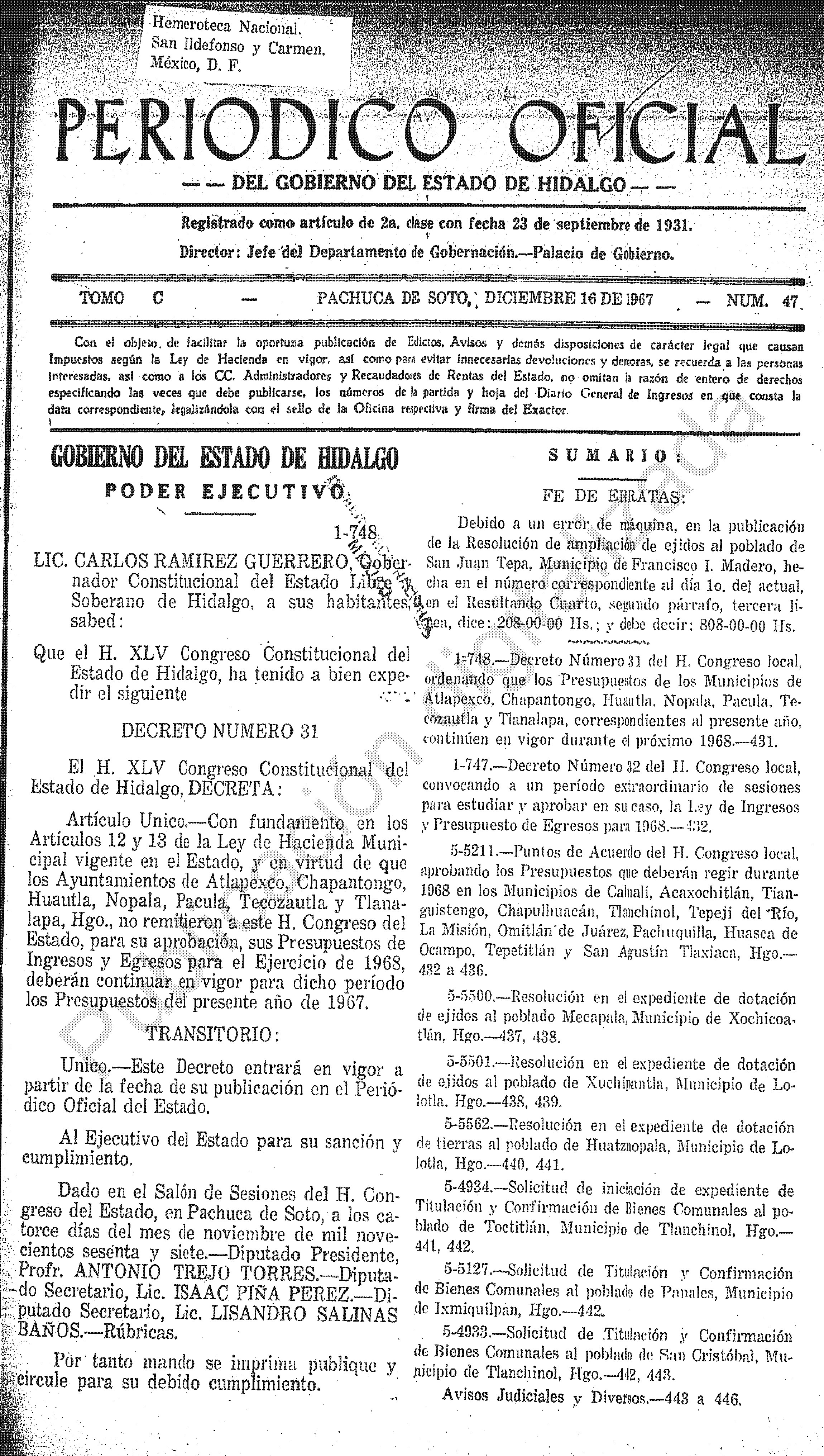 - 1-748.- Decreto Número 31 del H. Congreso local, ordenando que los Presupuestos de los Municipios de Atlapexco, Chapantongo, Huautla, Nopala, Pacula, Tecozautla y Tlanalapa, correspondientes al presente año, continúen en vigor durante el próximo