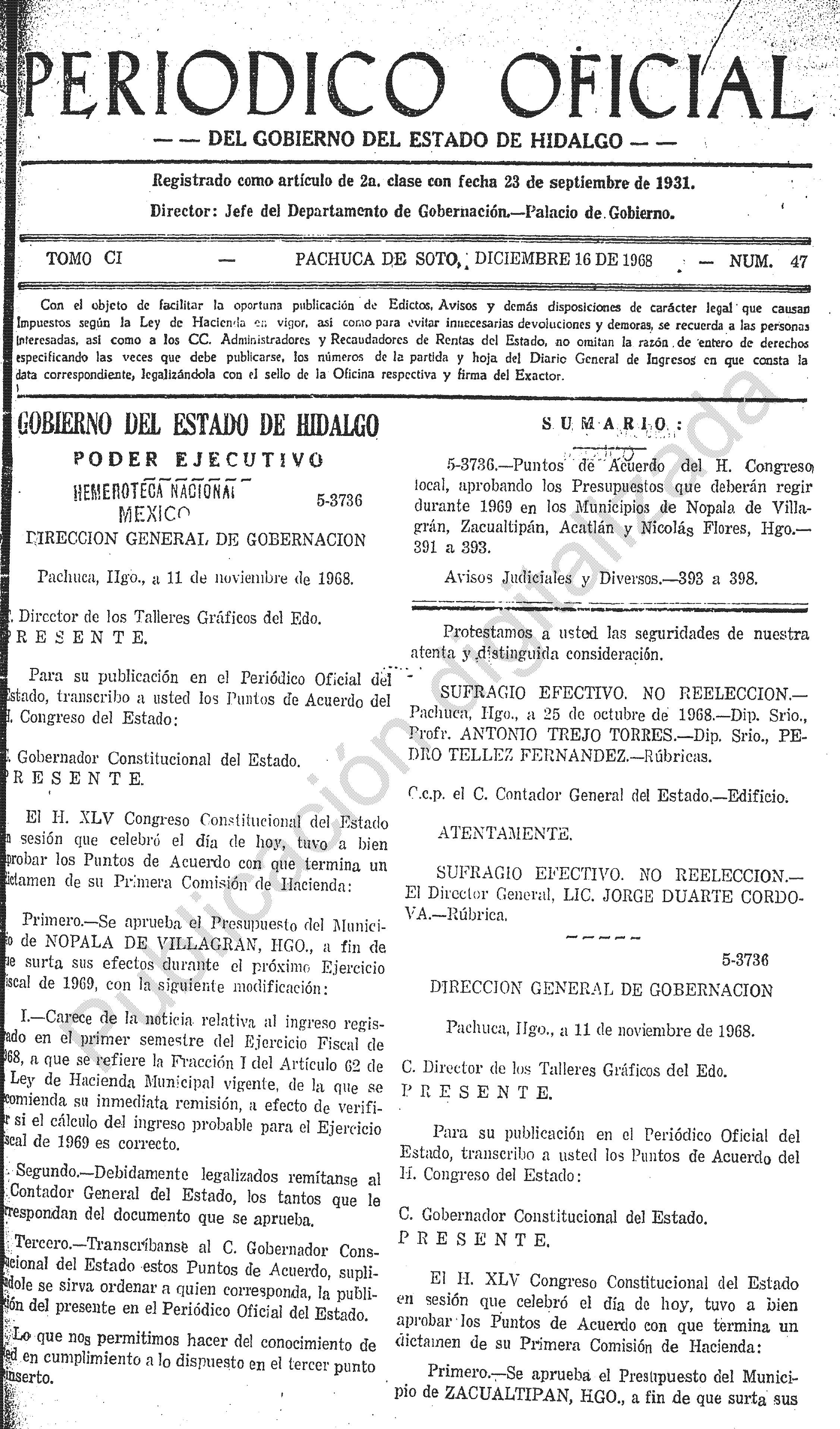 - 5-3736.- Puntos de Acuerdo del H. Congreso local, aprobando los Presupuestos que deberán regir durante 1969 en los Municipios de Nopala de Villagrán, Zacualtipán, Acatlán y Nicolás Flores, Hgo.