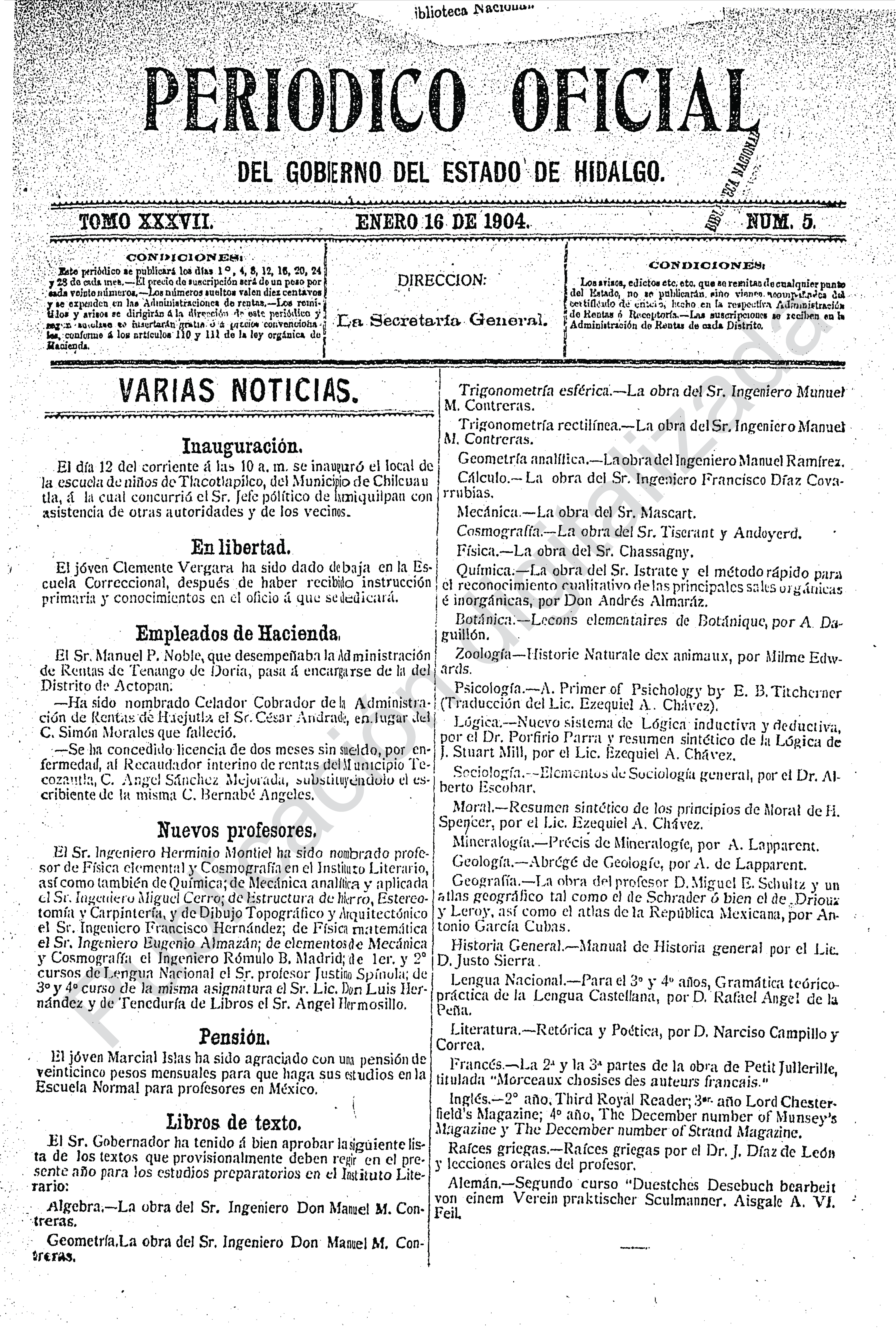 Periódico Oficial Ordinario 0 del 16 de enero de 1904