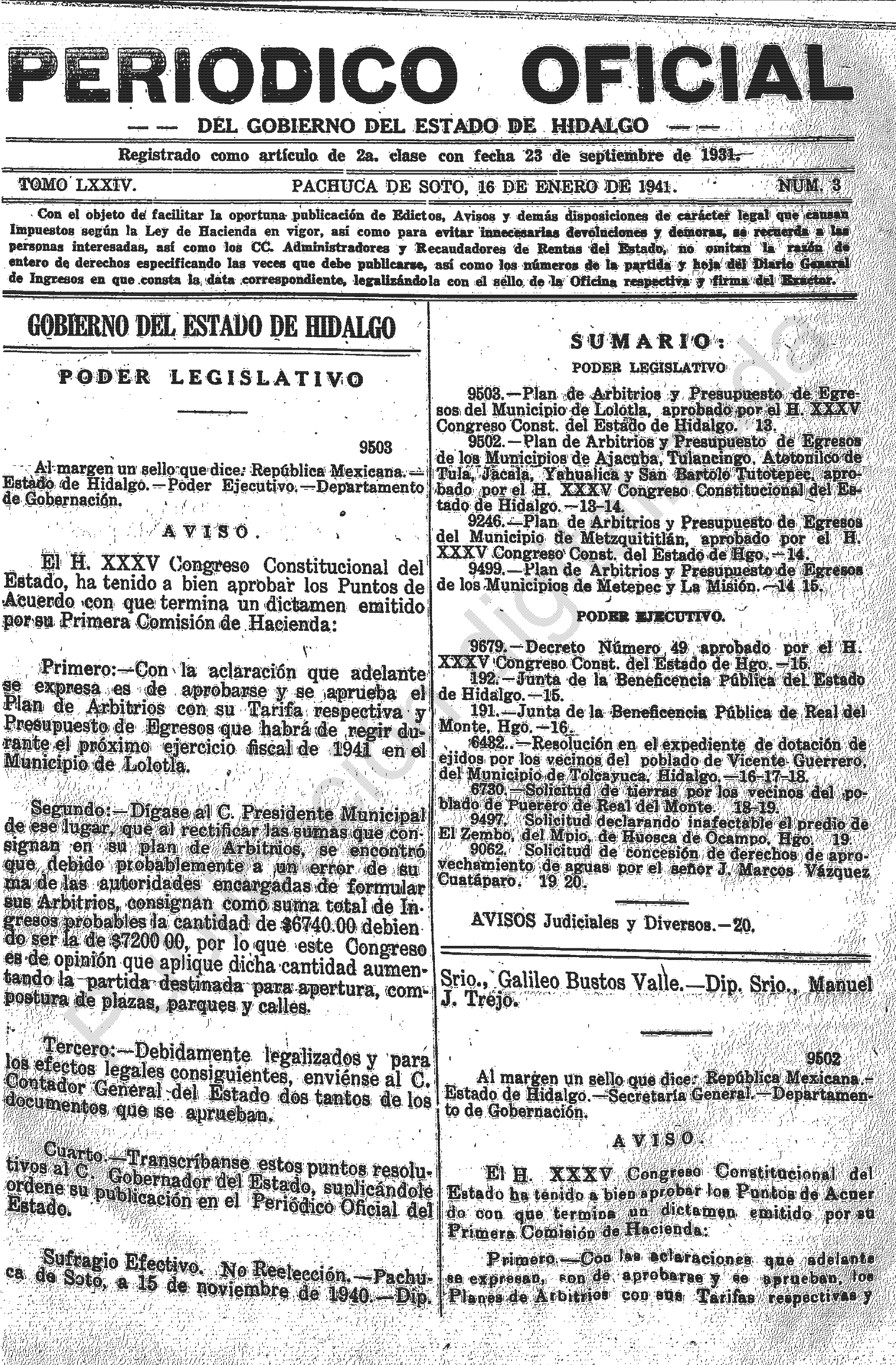 - 9503.- Plan de Arbitrios y Presupuesto de Egresos del Municipio de Lolotla, aprobado por el H. XXXV Congreso Const. del Estado de Hidalgo.