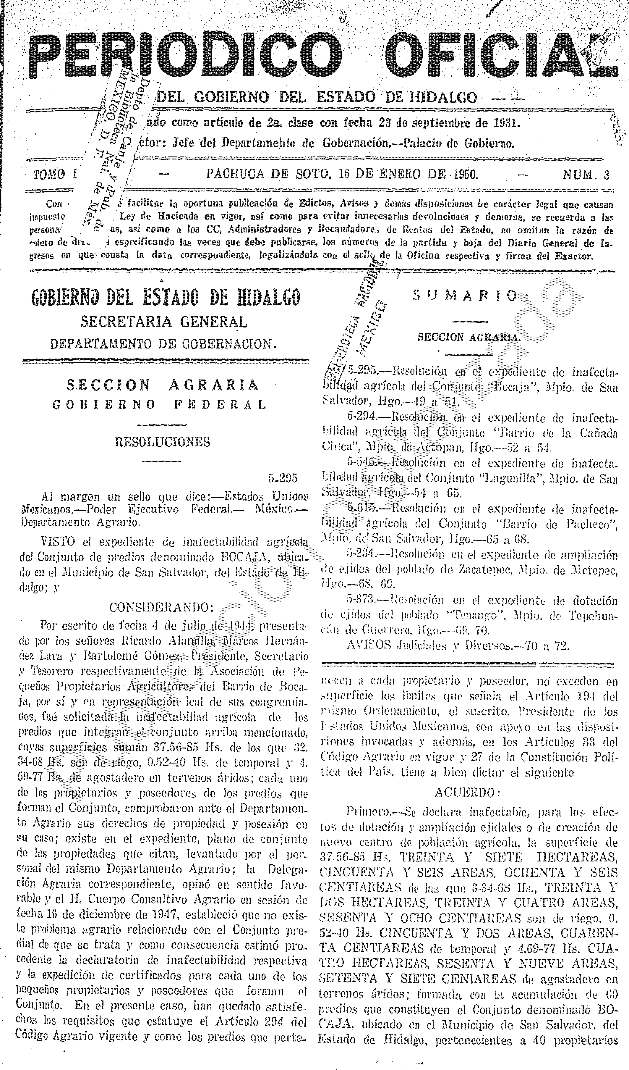 - 5-295.- Resolución en el expediente de inafectabilidad agrícola del Conjunto “Bocaja”, Mpio. de San Salvador, Hgo.