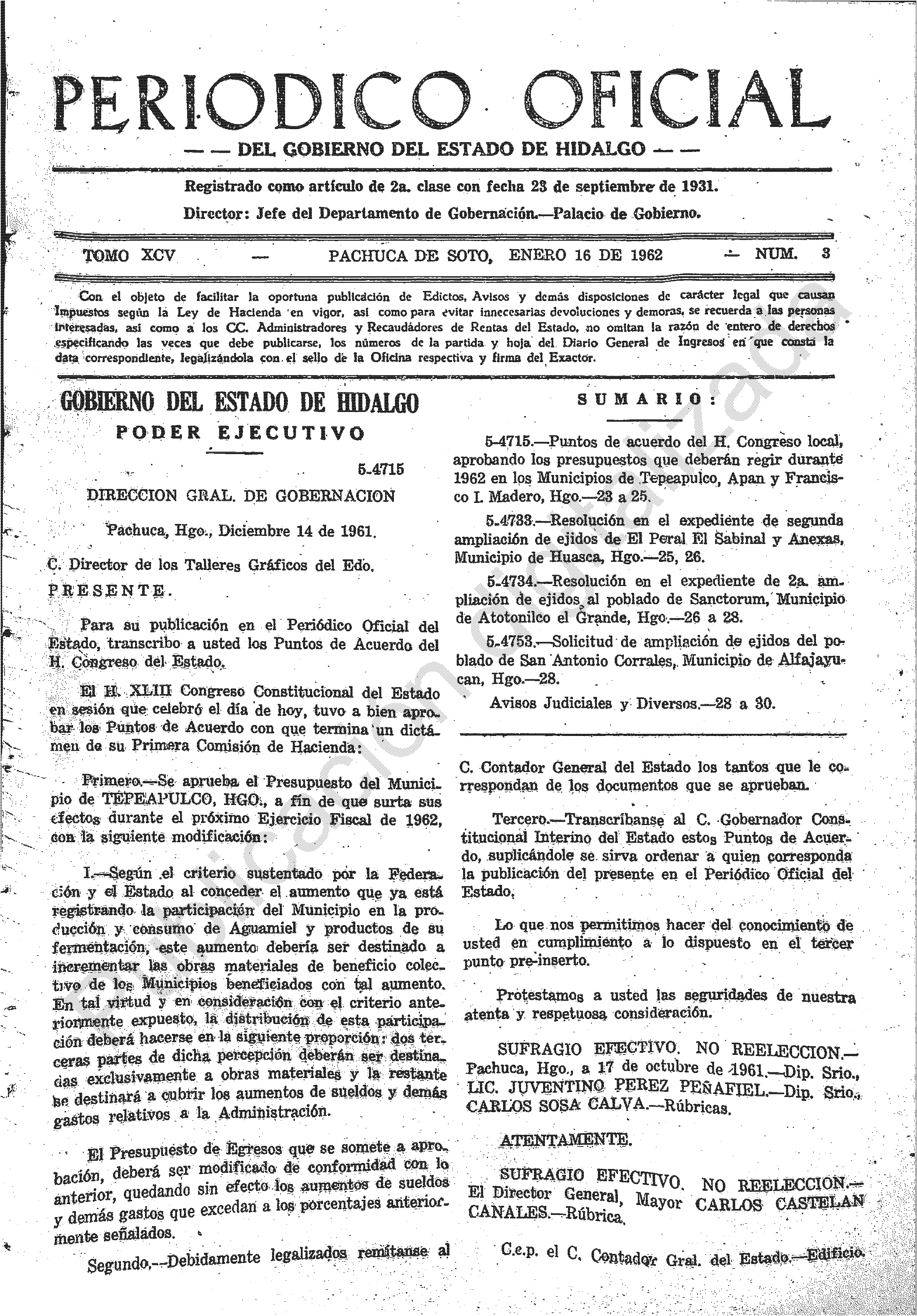 • 5-4715.- Puntos de acuerdo del H. Congreso local, aprobando los presupuestos que deberán regir durante 1962 en los Municipios de Tepeapulco, Apan y Francisco I. Madero, Hgo.