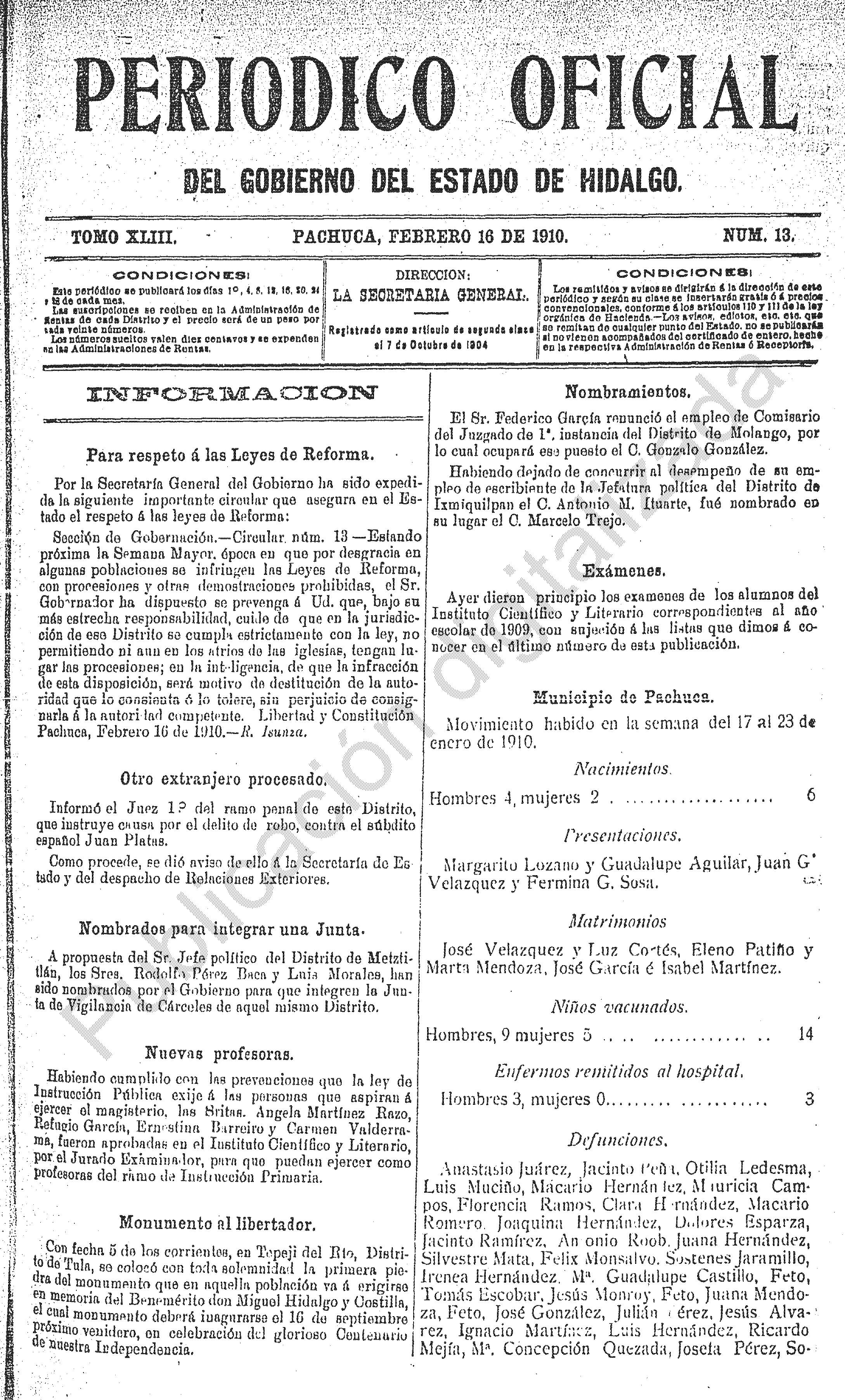 Periódico Oficial Ordinario 0 del 16 de febrero de 1910