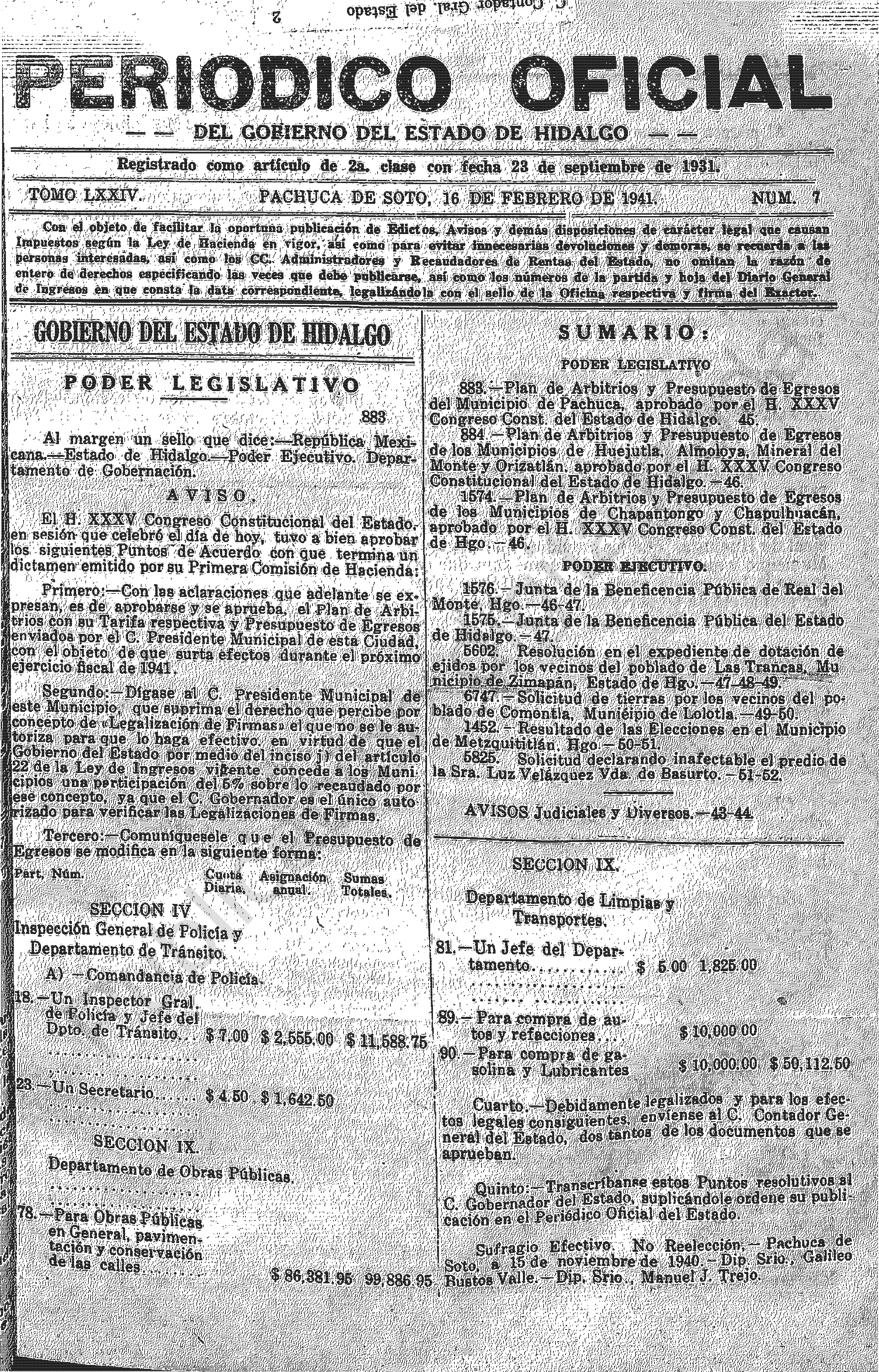 - 883.- Plan de Arbitrios y Presupuesto de Egresos del Municipio de Pachuca, aprobado por el H. XXXV Congreso Const. del Estado de Hidalgo.