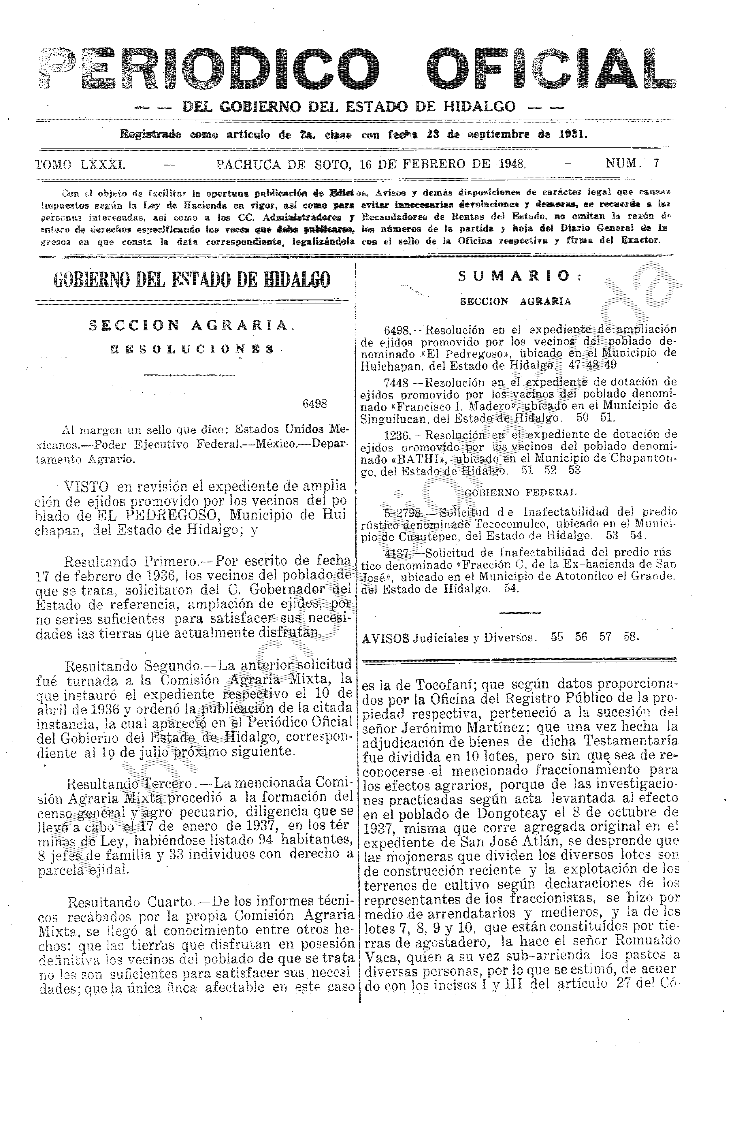 - 6498.- Resolución en el expediente de ampliación de ejidos promovido por los vecinos del poblado denominado “El Pedregoso”, ubicado en el Municipio de Huichapan, del Estado de Hidalgo.