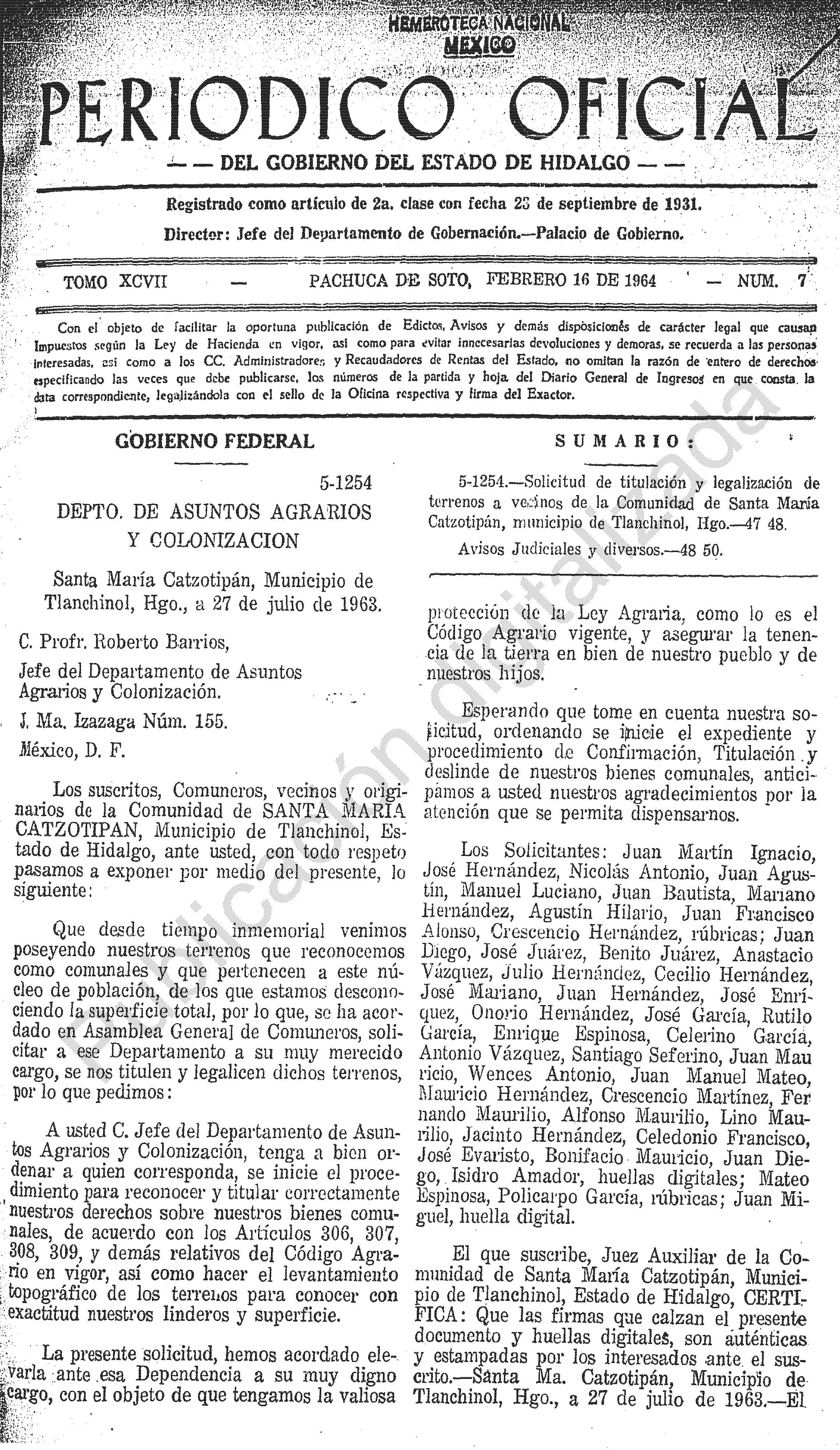- 5-1254.- Solicitud de titulación y legalización de terrenos a vecinos de la Comunidad de Santa María Catzotipán, municipio de Tlanchinol, Hgo.