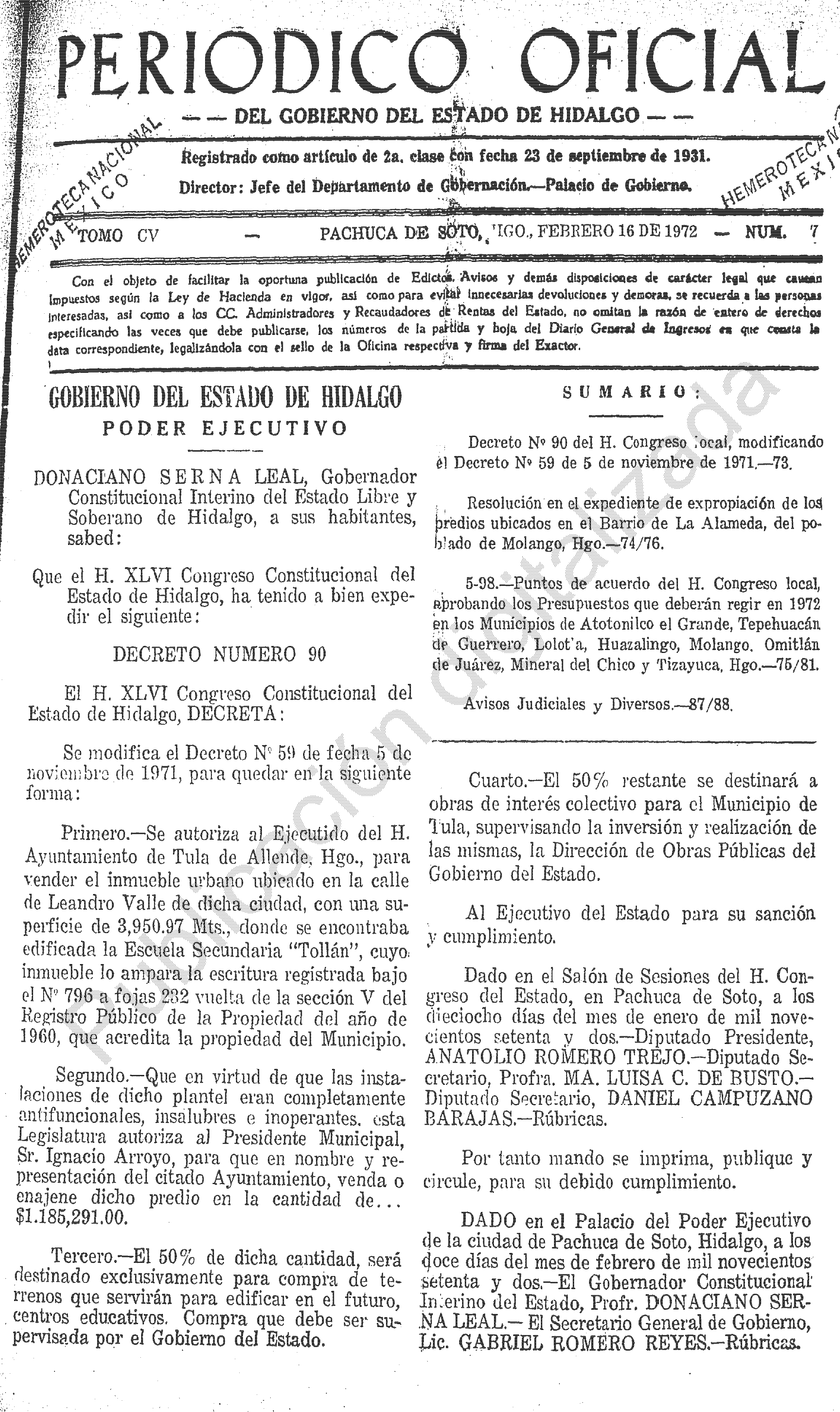 Resolución en el expediente de Expropiación de los predios ubicados en el Barrio de La Alameda, del poblado de Molango, Hgo. - 5-98.- Puntos de acuerdo del H. Congreso local, aprobando los Presupuestos que deberán regir en 1972 en los Municipios de Atotonilco el Grande, Tepehuacán de Guerrero, Lolotla, Huazalingo, Molango, Omitlán de Juárez, Mineral del Chico y Tizayuca, Hgo.