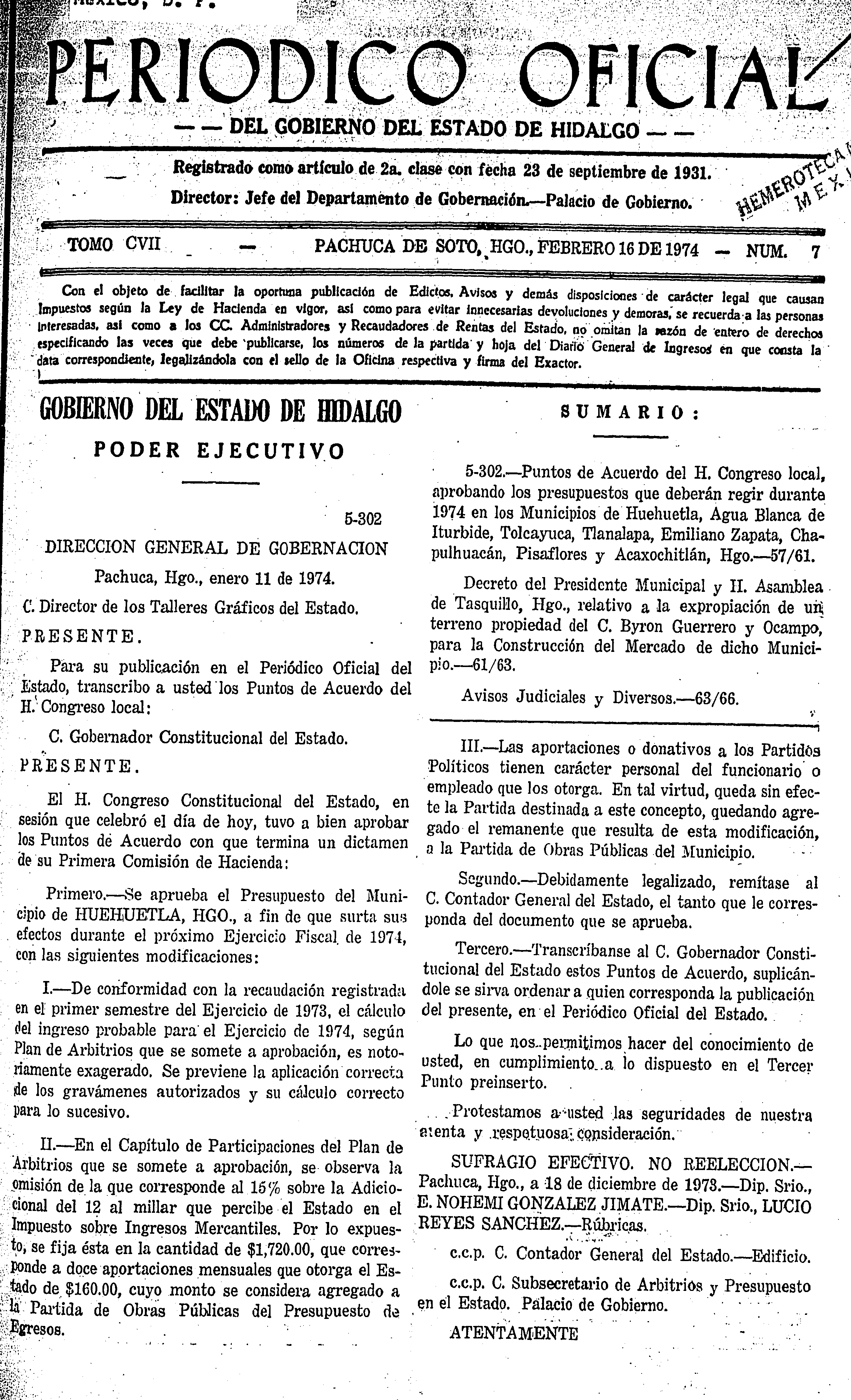 - 5-302.- Puntos de Acuerdo del H. Congreso local, aprobando los presupuestos que deberán regir durante 1974 en los Municipios de Huehuetla, Agua Blanca de Iturbide, Tolcayuca, Tlanalapa, Emiliano Zapata, Chapulhuacán, Pisaflores y Acaxochitlán, Hgo.