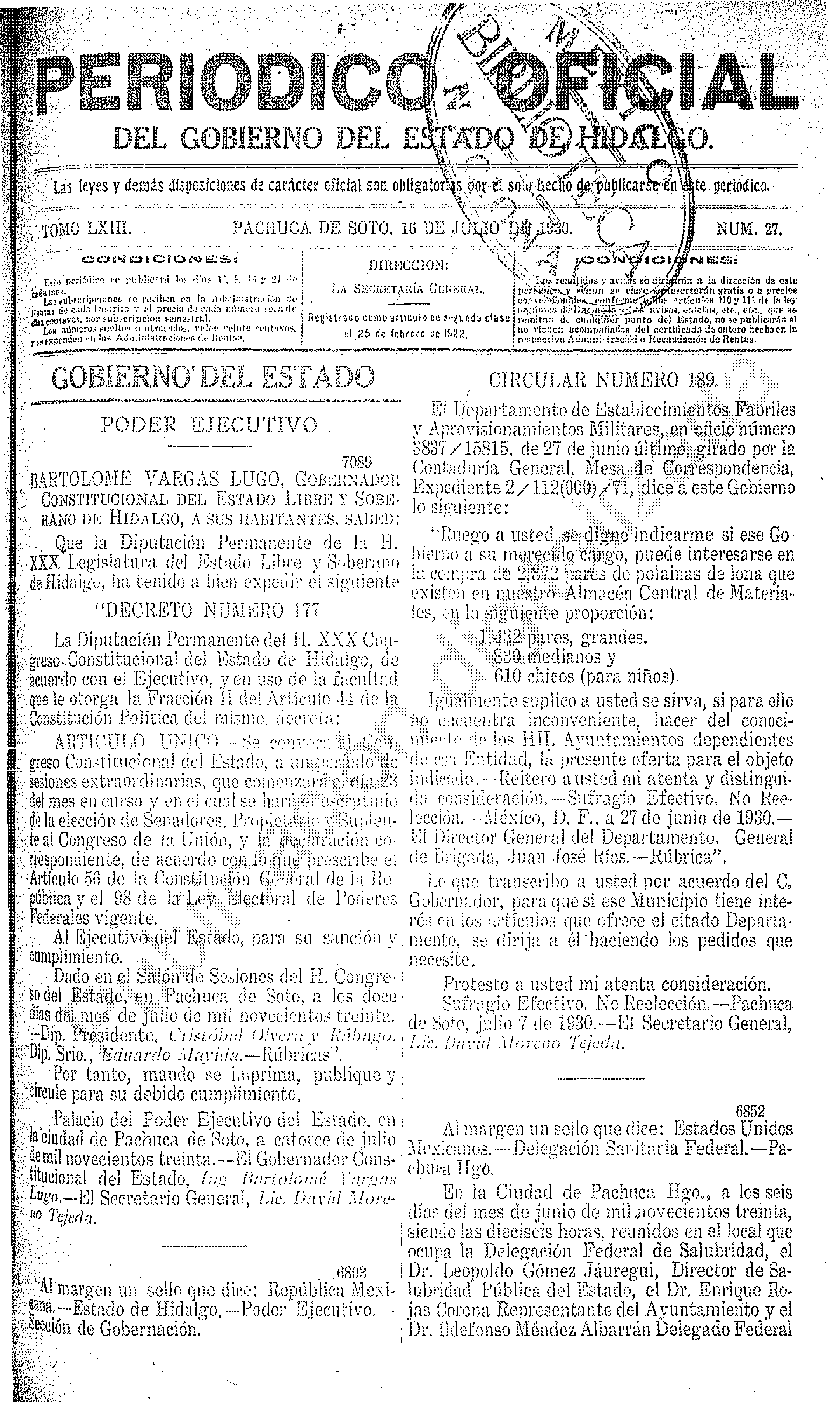 Periódico Oficial Ordinario 0 del 16 de julio de 1930