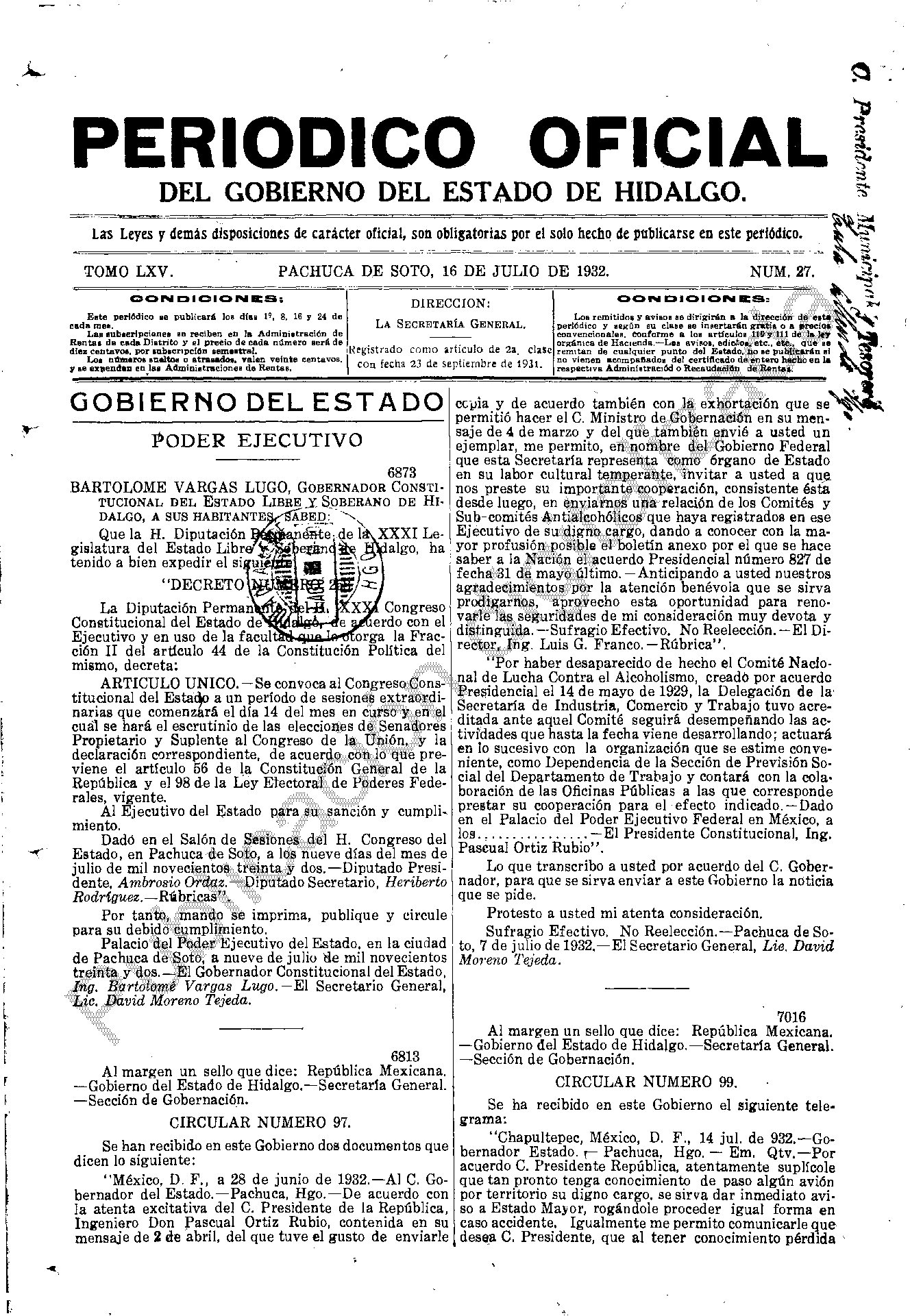 Descargar Periódico Oficial Ordinario 0 del 16 de julio de 1932