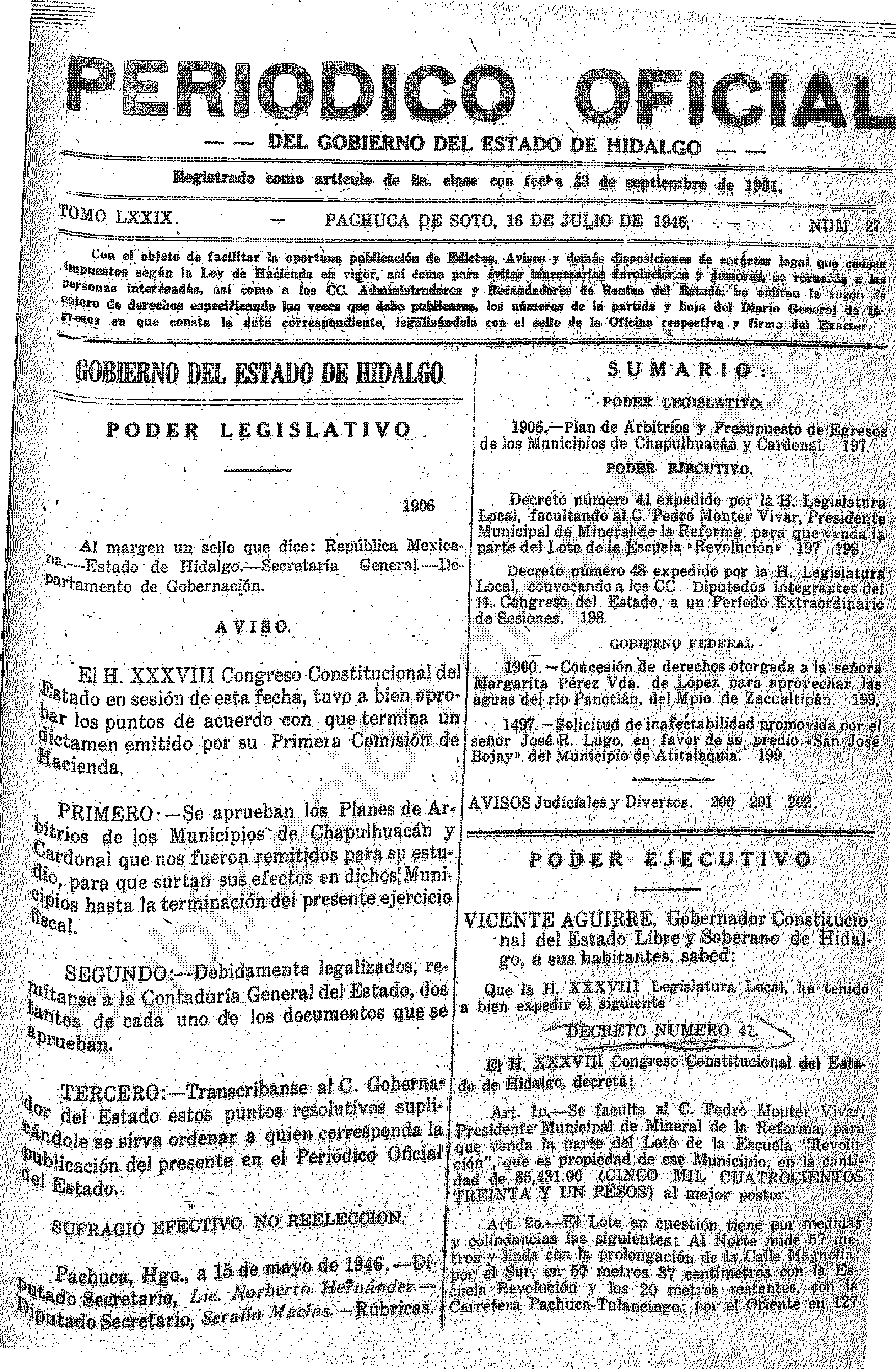 Decreto número 41 expedido por la H. Legislatura Local, facultando al C. Pedro Monter Vivar, Presidente Municipal de Mineral de la Reforma, para que venda la parte del Lote de la Escuela “Revolución”