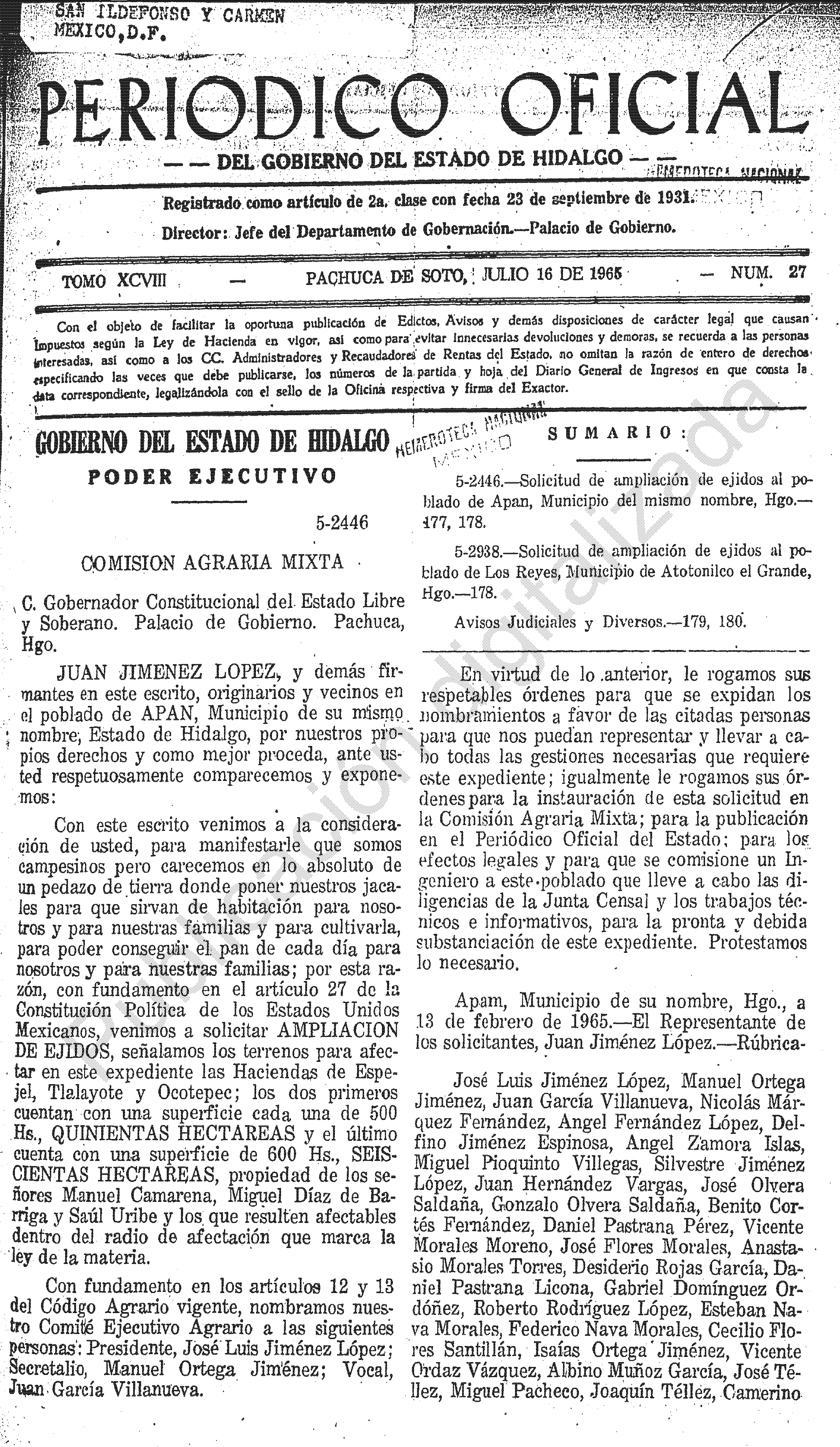 - 5-2446.- Solicitud de ampliación de ejidos al poblado de Apan, Municipio del mismo nombre, Hgo.