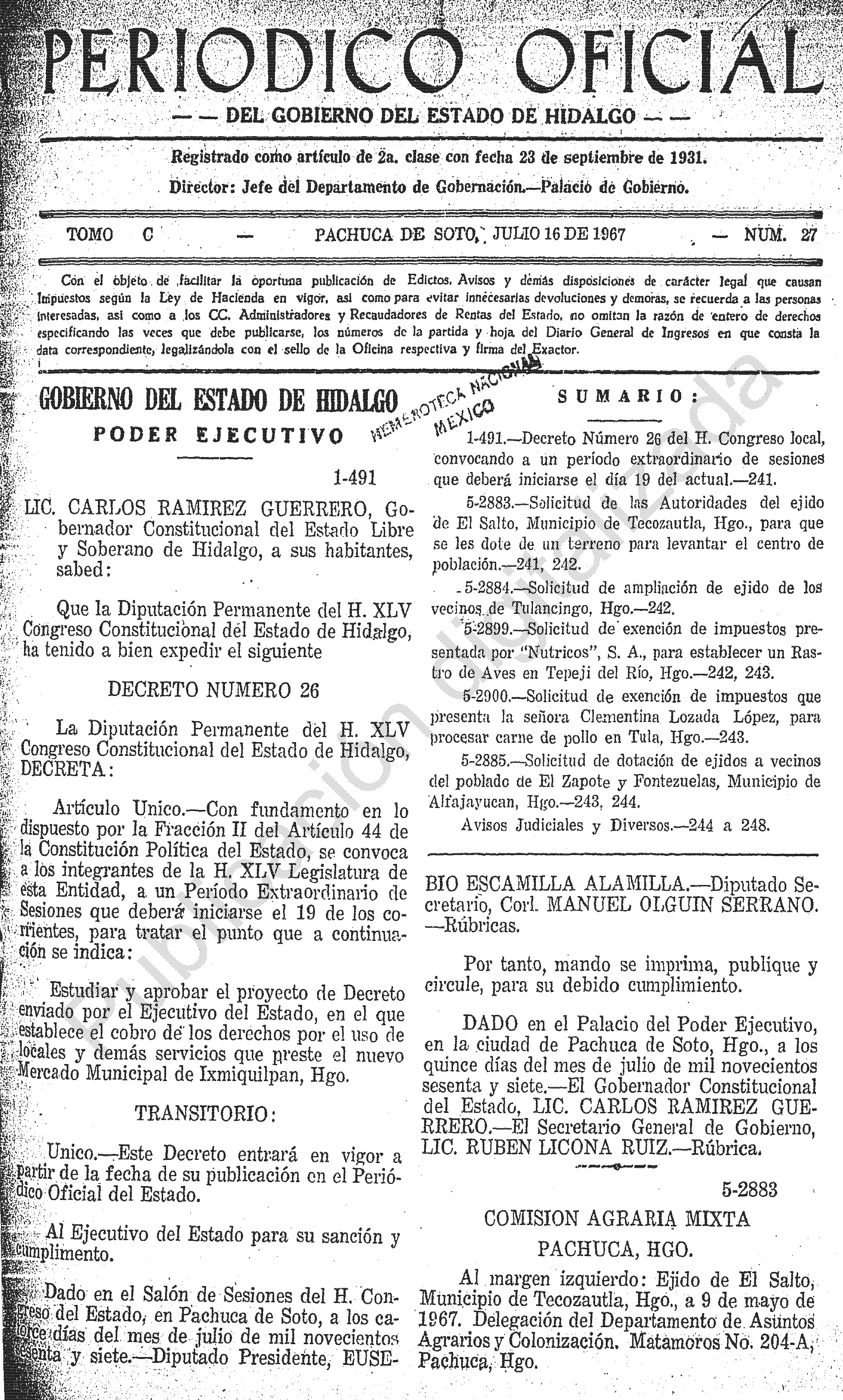 Descargar Periódico Oficial Ordinario 0 del 16 de julio de 1967