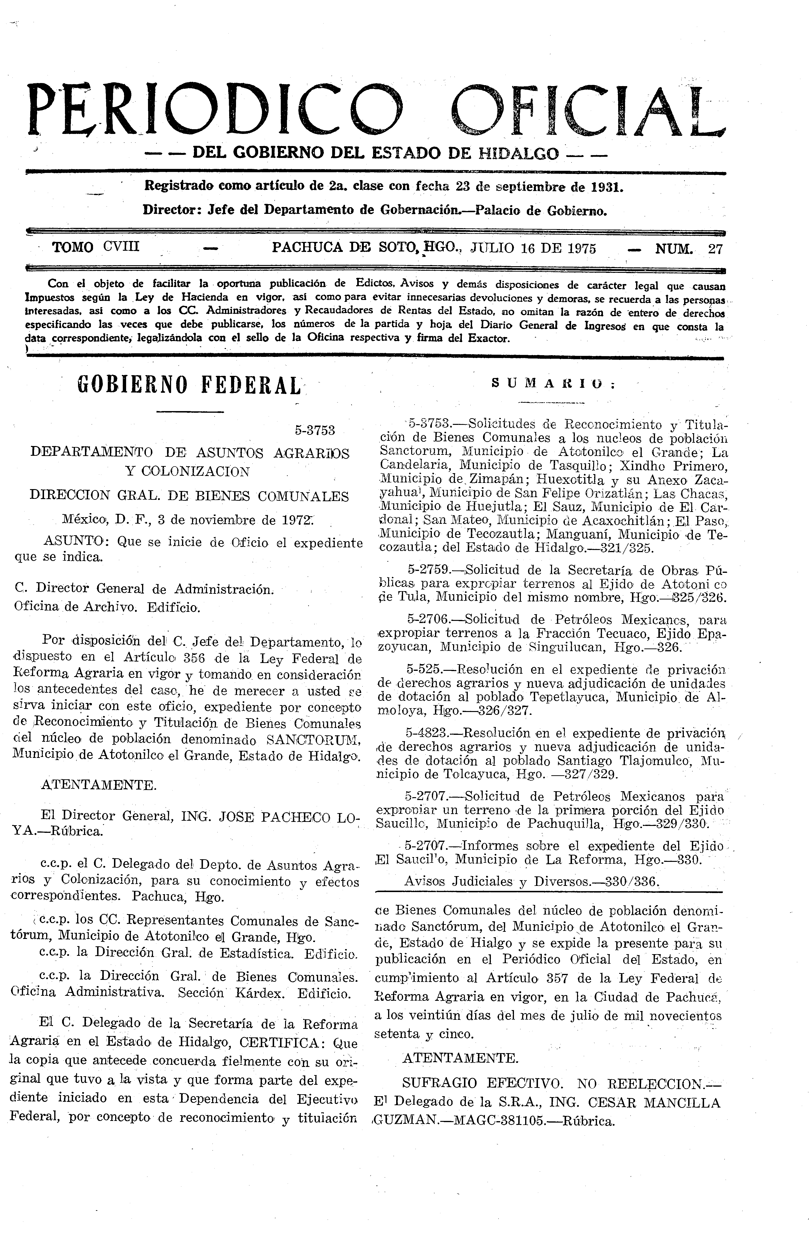- 5-3753.- Solicitudes de Reconocimiento y Titulación de Bienes Comunales a los núcleos de población Sanctorum, Municipio de Atotonilco el Grande, La Candelaria, Municipio de Tasquillo, Xindho Primero, Municipio de Zimapán, Huexotitla y su Anexo Zacayahual, Municipio de San Felipe Orizatlán, Las Chacas, Municipio de Huejutla, El Sauz, Municipio de El Cardonal, San Mateo, Municipio de Acaxochitlán, El Paso, Municipio de Tecozautla, Manguani, Municipio de Tecozautla, del Estado de Hidalgo.