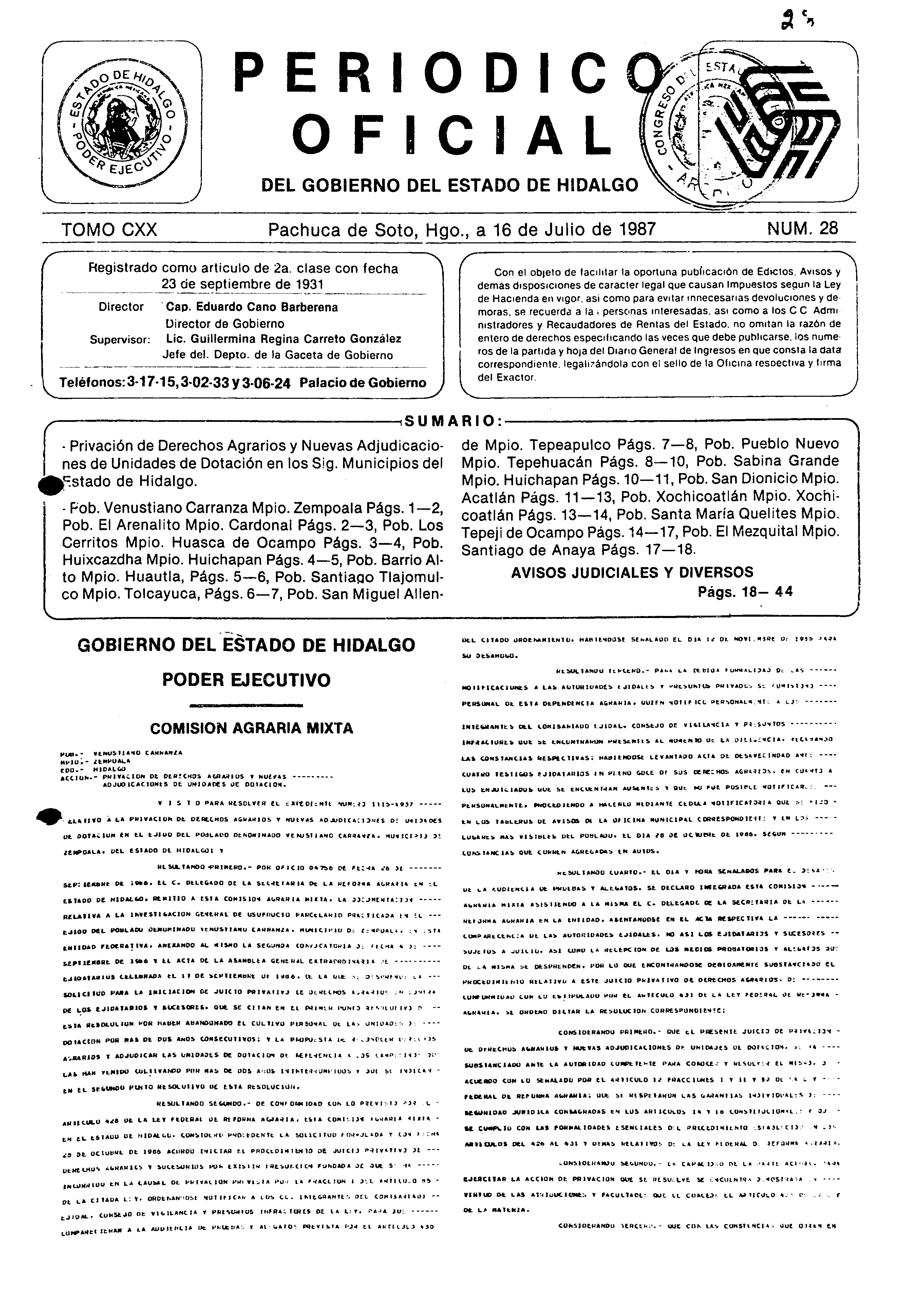 Descargar Periódico Oficial Ordinario 0 del 16 de julio de 1987