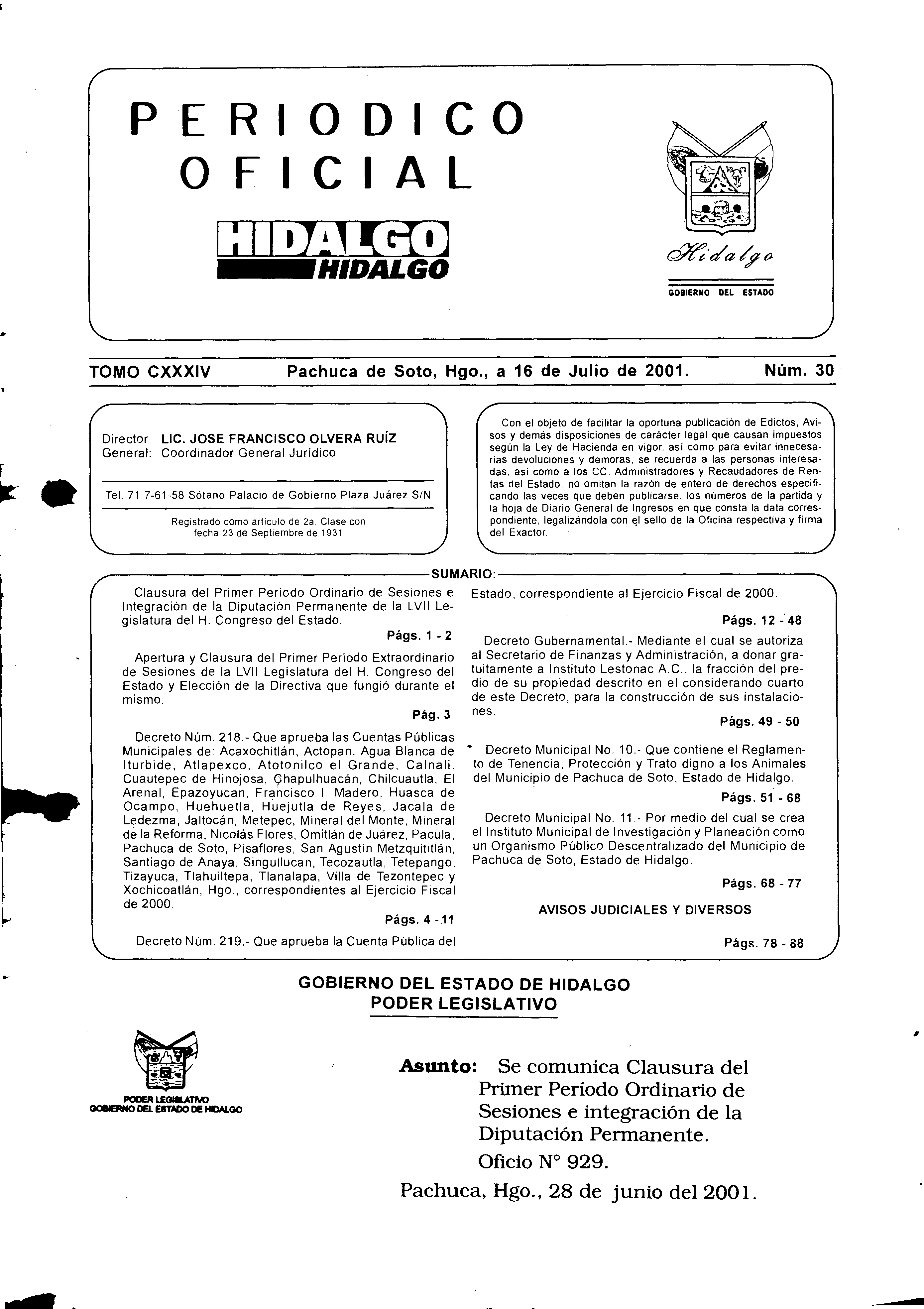 Descargar Periódico Oficial Ordinario 0 del 16 de julio de 2001
