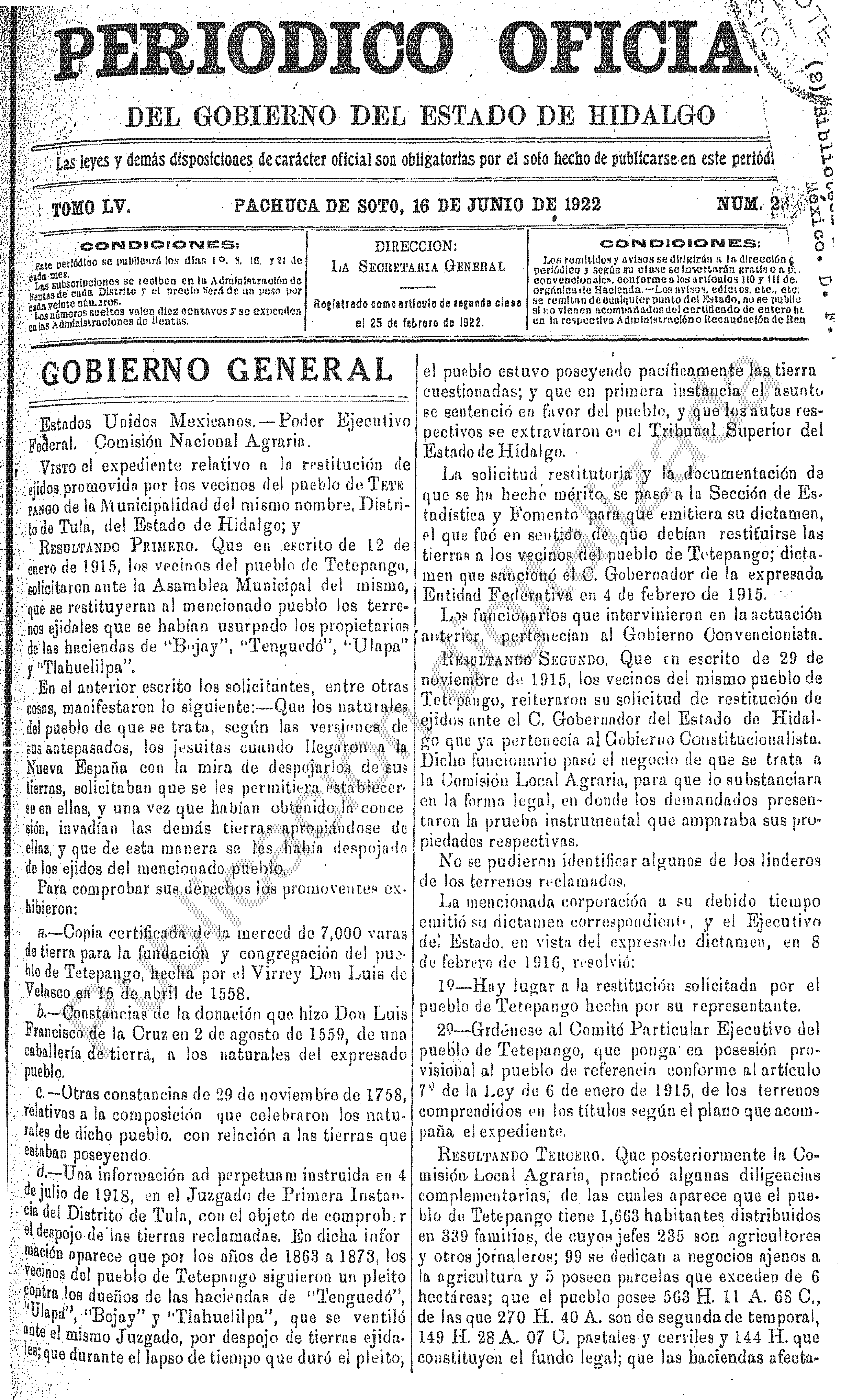Descargar Periódico Oficial Ordinario 0 del 16 de junio de 1922El portal web del Periódico Oficial del Estado de hidalgo es el único medio de difusión oficial del Gobierno del Estado de Hidalgo