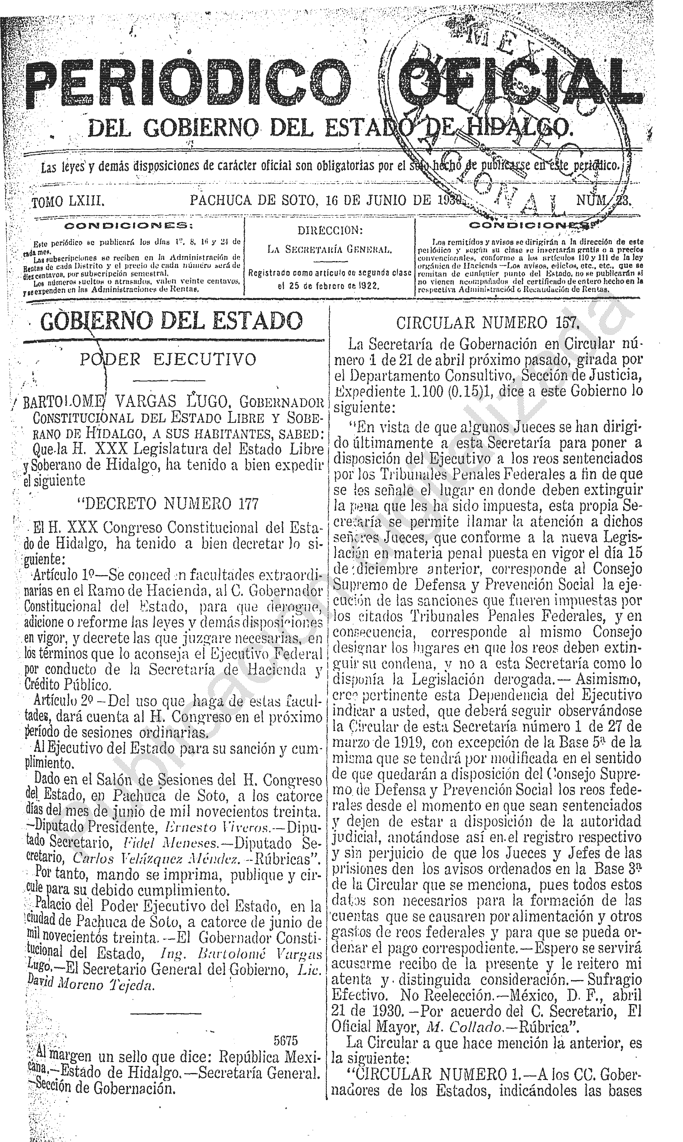 Descargar Periódico Oficial Ordinario 0 del 16 de junio de 1930