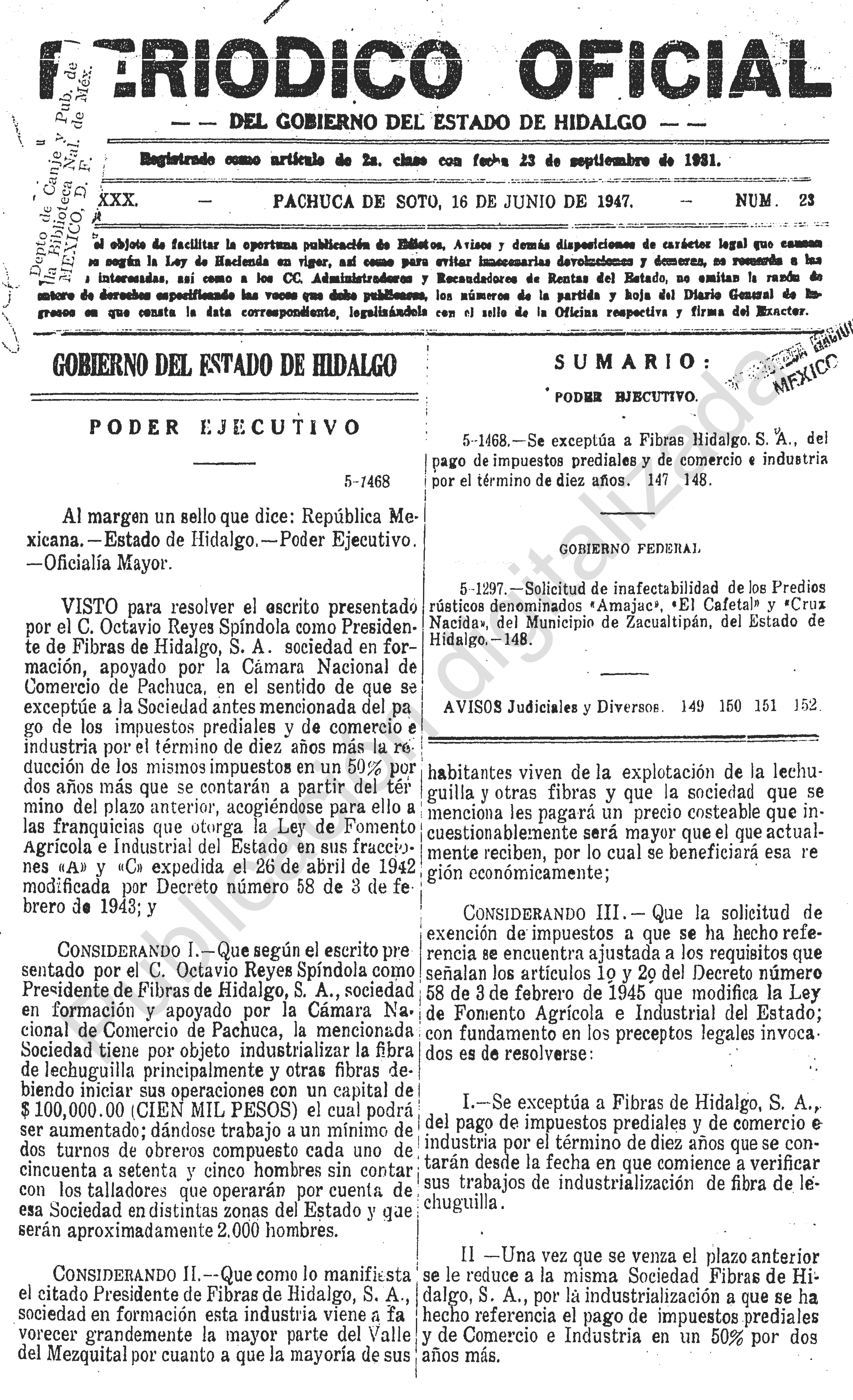 • 5-1468.- Se exceptúa a Fibras Hidalgo, S. A., del pago de impuestos prediales y de comercio e industria por el término de diez años.