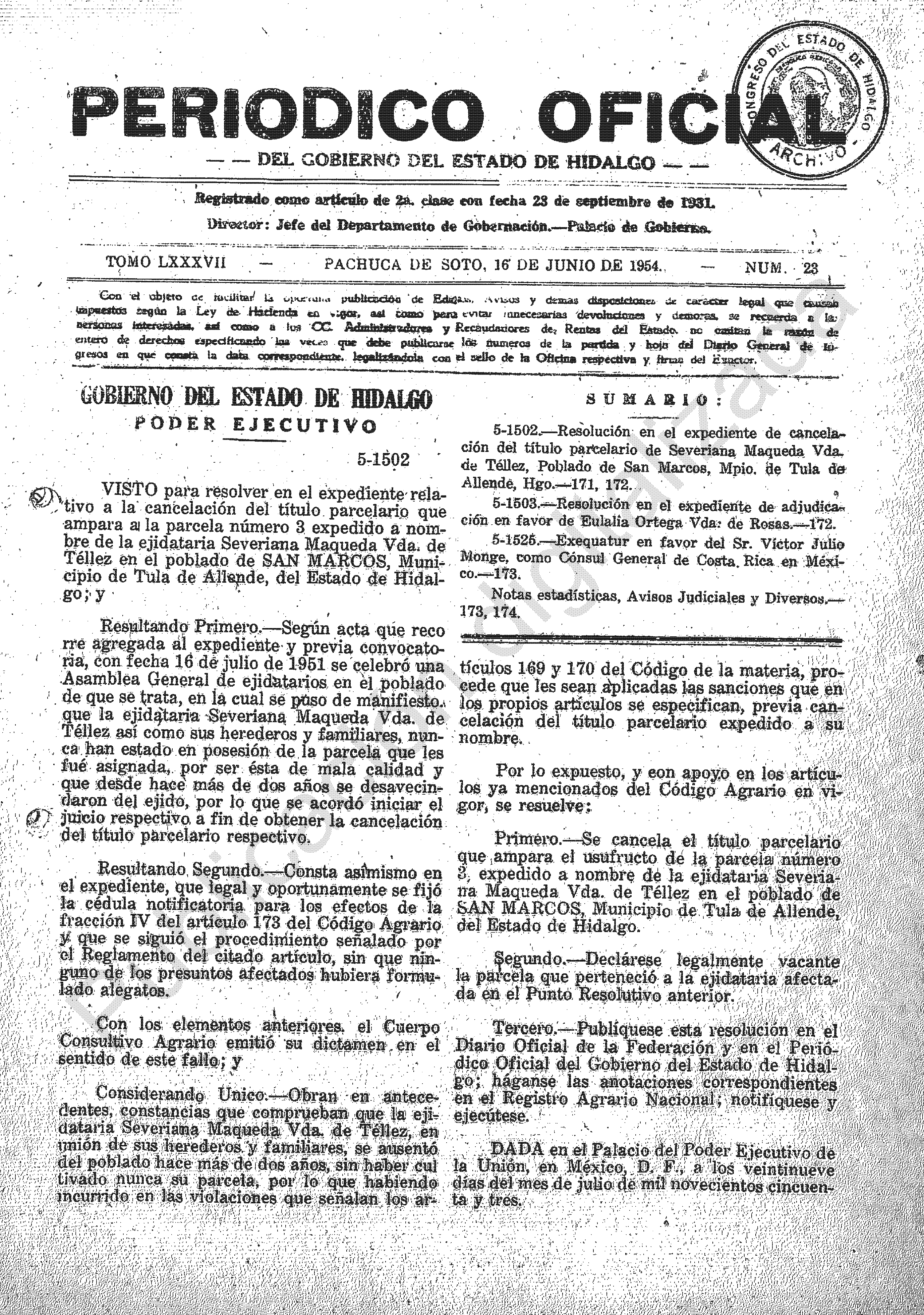 • 5-1502.- Resolución en el expediente de cancelación del título parcelario de Severiana Maqueda Vda. de Téllez, Poblado de San Marcos, Mpio. de Tula de Allende, Hgo.
