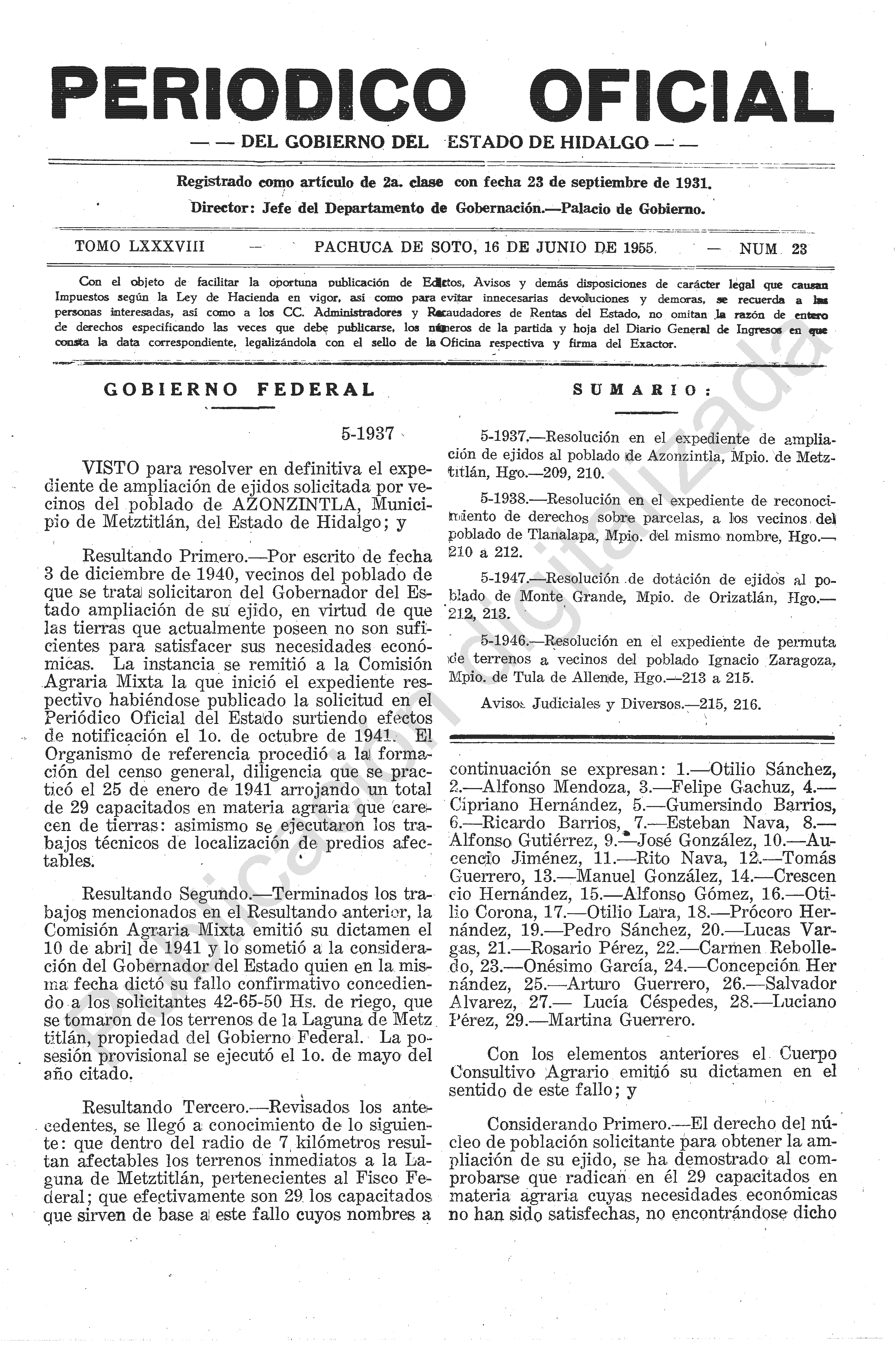 - 5-1937.- Resolución en el expediente de ampliación de ejidos al poblado de Azonzintla, Mpio. de Metztitlán, Hgo.