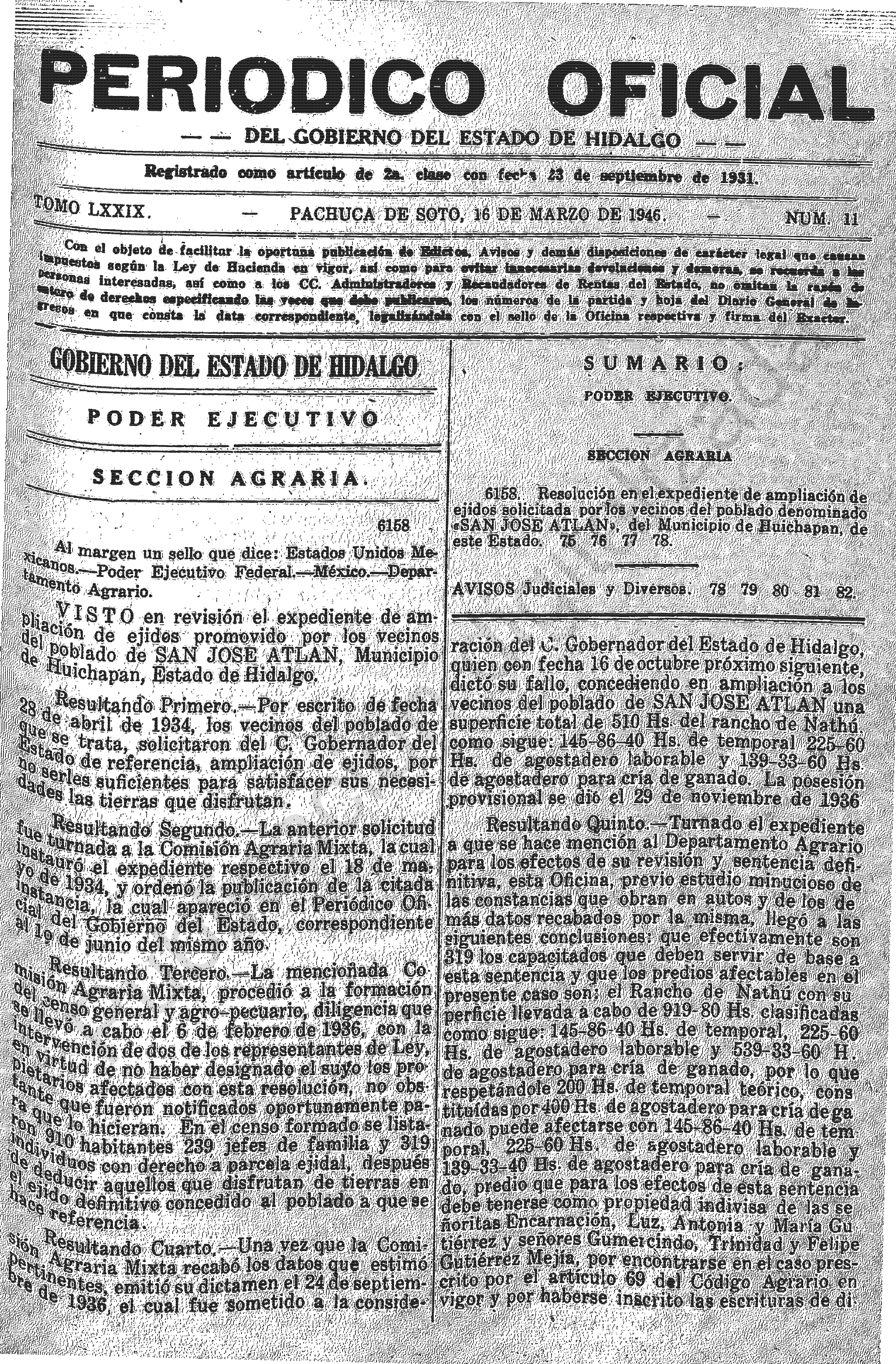 - 6158.- Resolución en el expediente de ampliación de ejidos solicitada por los vecinos del poblado denominado “SAN JOSE ATLAN”, del Municipio de Huichapan, de este Estado.