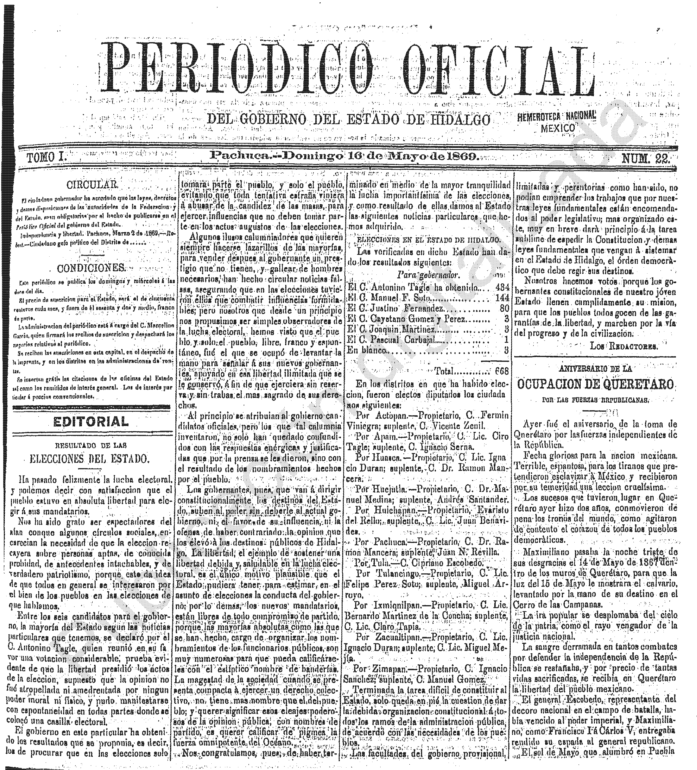 Descargar Periódico Oficial Ordinario 0 del 16 de mayo de 1869El portal web del Periódico Oficial del Estado de hidalgo es el único medio de difusión oficial del Gobierno del Estado de Hidalgo