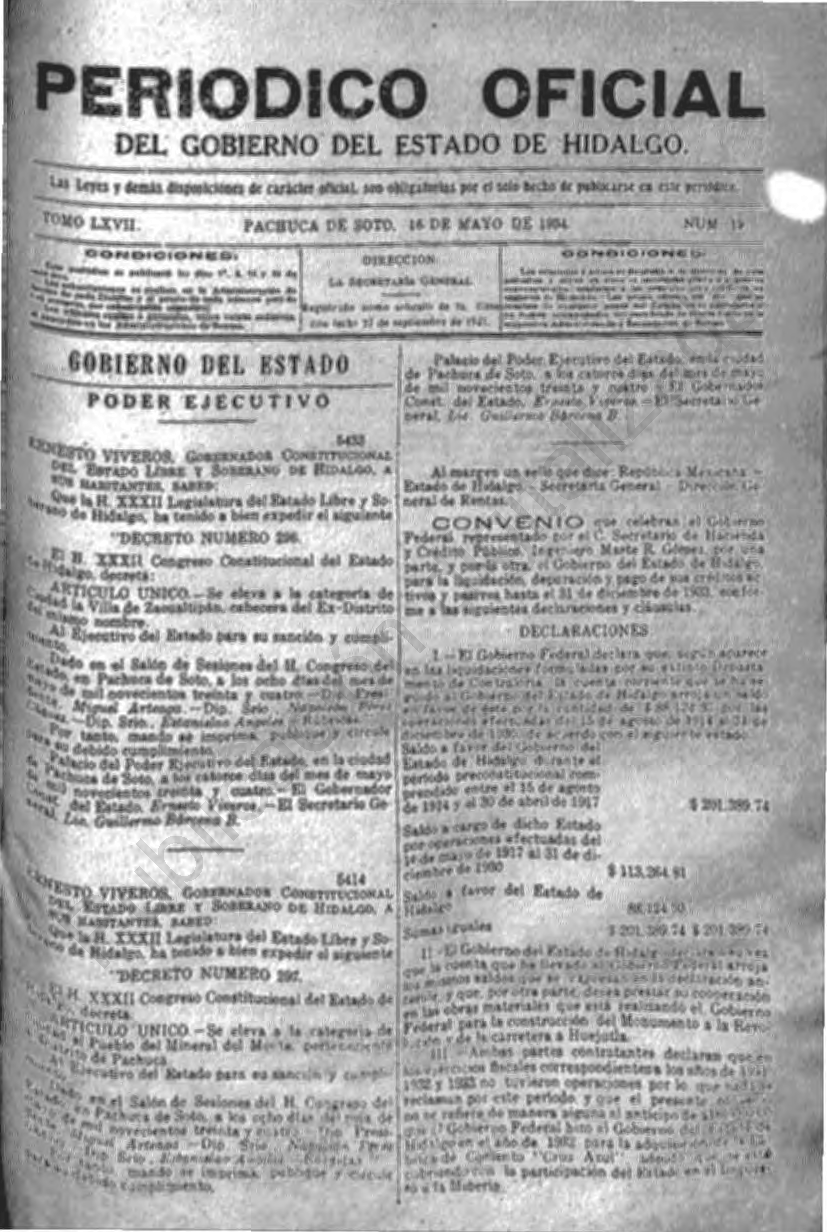 - 5414.- Decreto Número 297, Se eleva a la categoría de Ciudad el Pueblo de Mineral del Monte, perteneciente al Distrito de Pachuca.