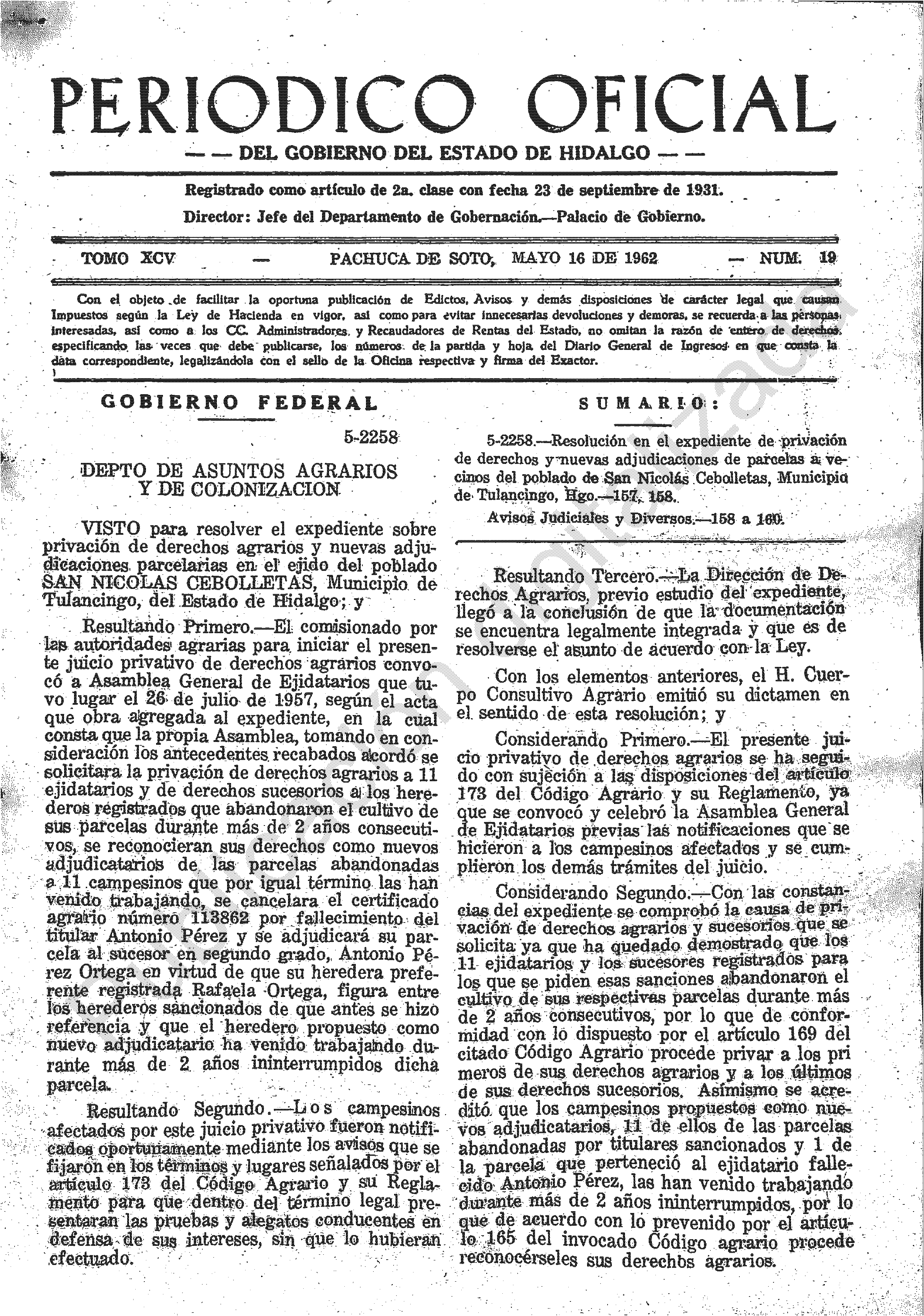 - 5-2258.- Resolución en el expediente de privación de derechos y nuevas adjudicaciones de parcelas a vecinos del poblado de San Nicolás Cebolletas, Municipio de Tulancingo, Hgo.