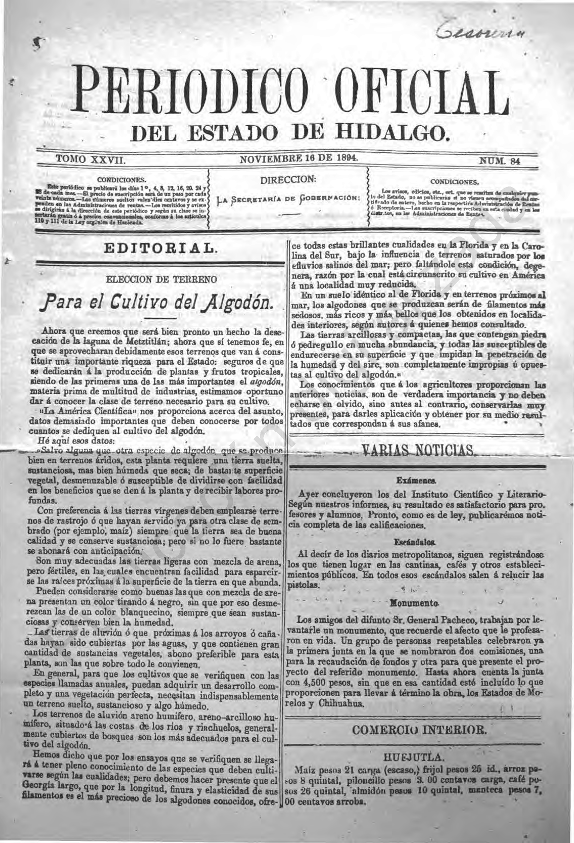 Periódico Oficial Ordinario 0 del 16 de noviembre de 1894