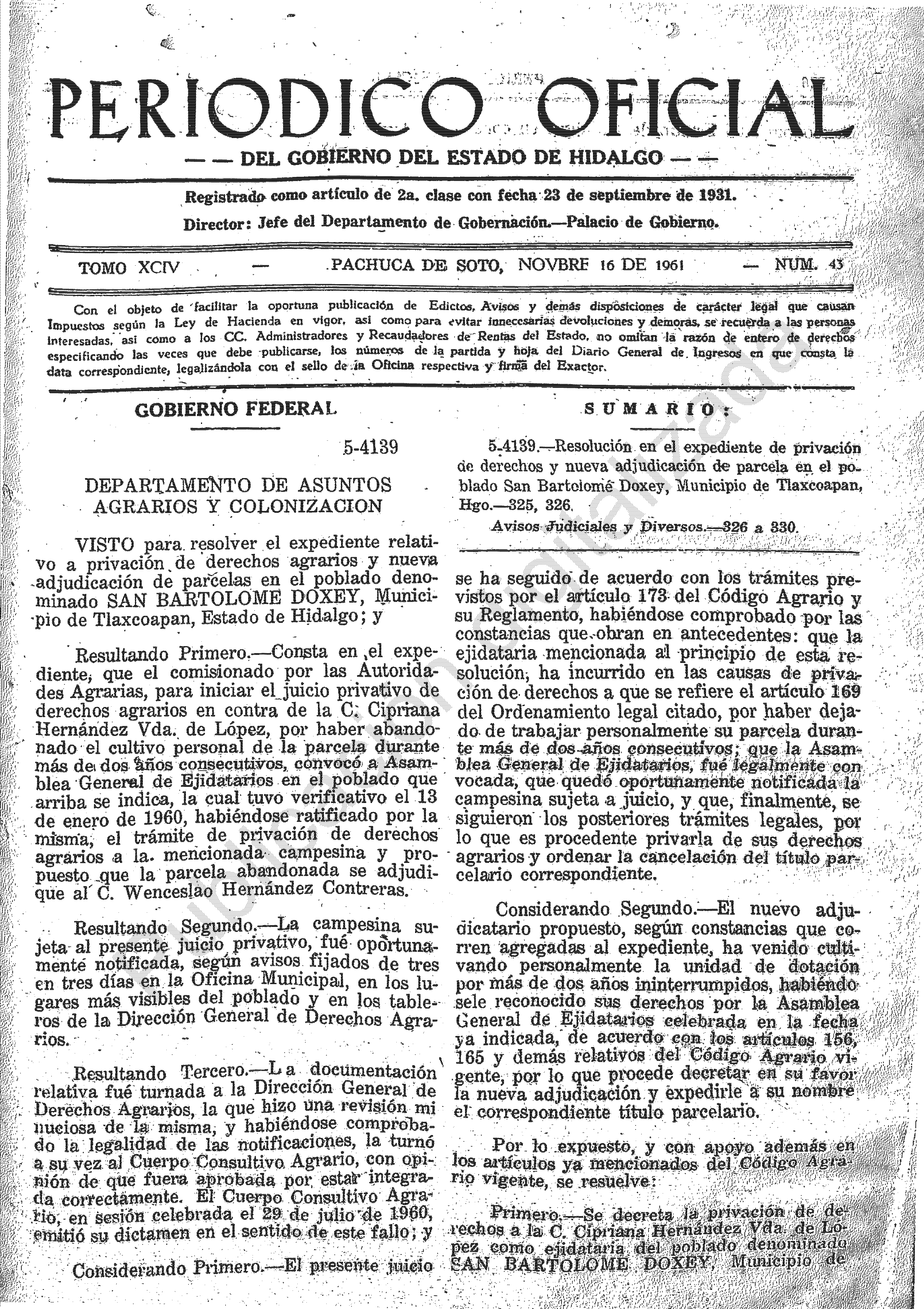 • 5-4139.- Resolución en el expediente de privación de derechos y nueva adjudicación de parcela en el poblado San Bartolomé Doxey, Municipio de Tlaxcoapan, Hgo.