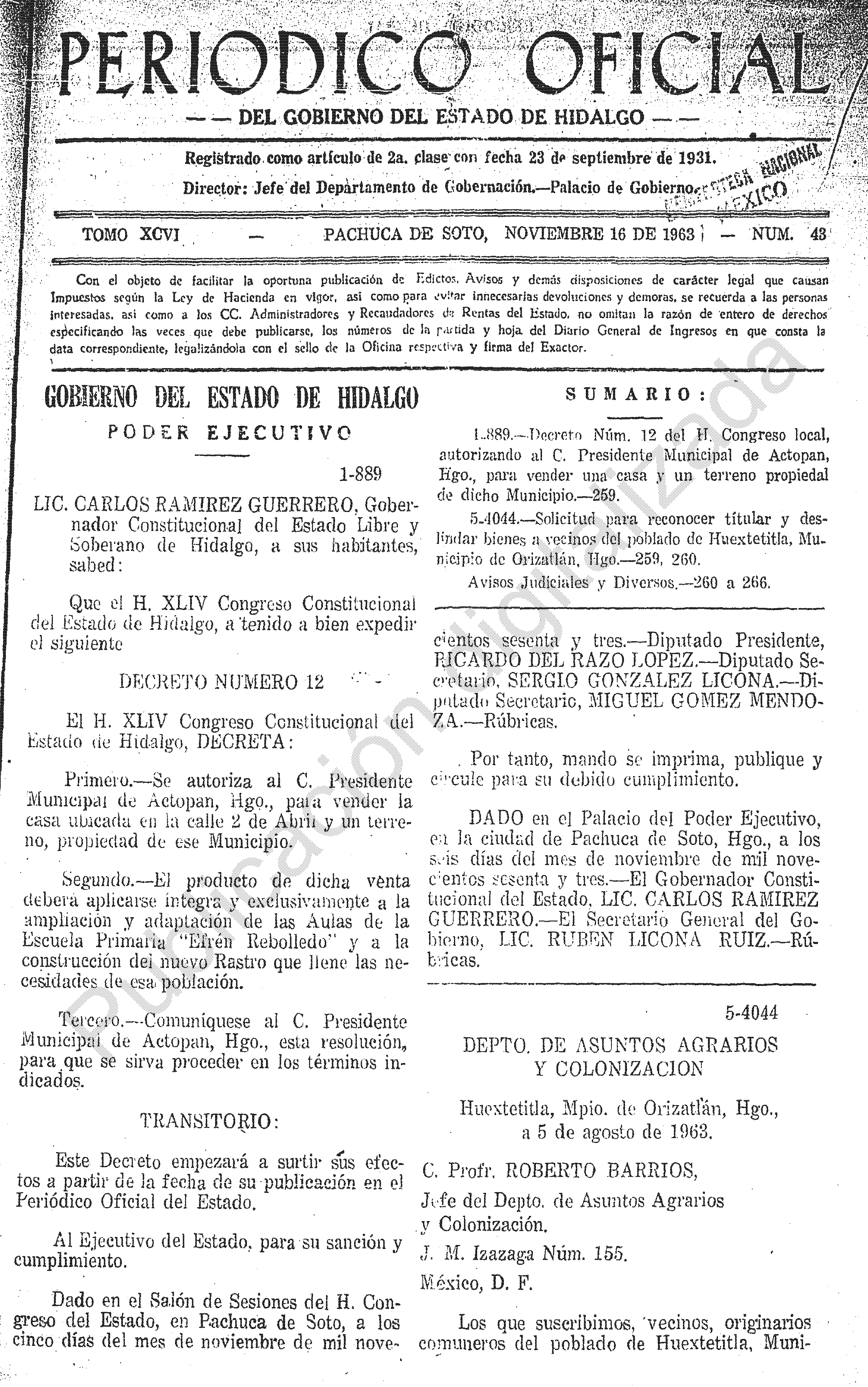Descargar Periódico Oficial Ordinario 0 del 16 de noviembre de 1963