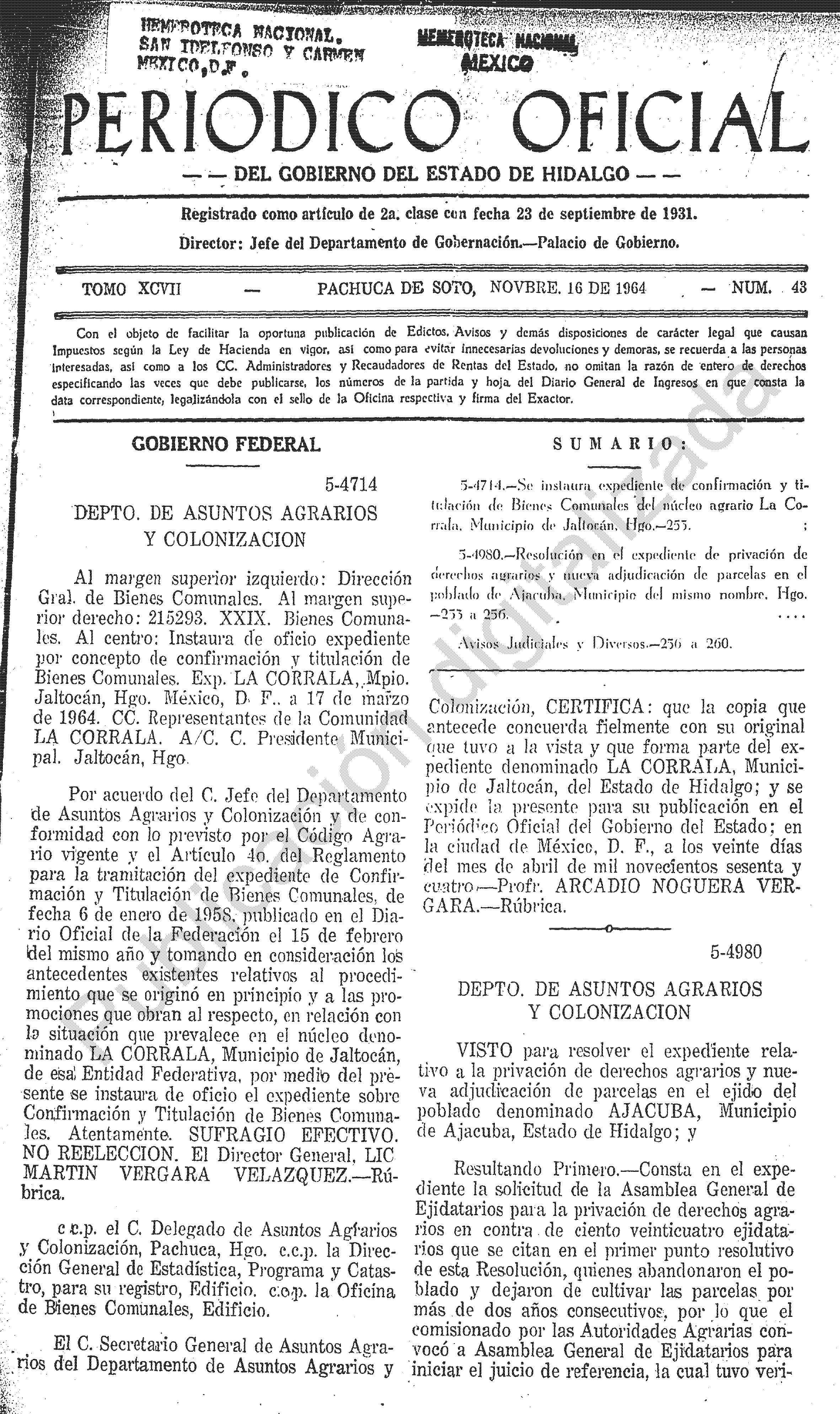 - 5-4714.- Se instaura expediente de confirmación y titulación de Bienes Comunales del núcleo agrario La Corrala, Municipio de Jaltocán, Hgo.