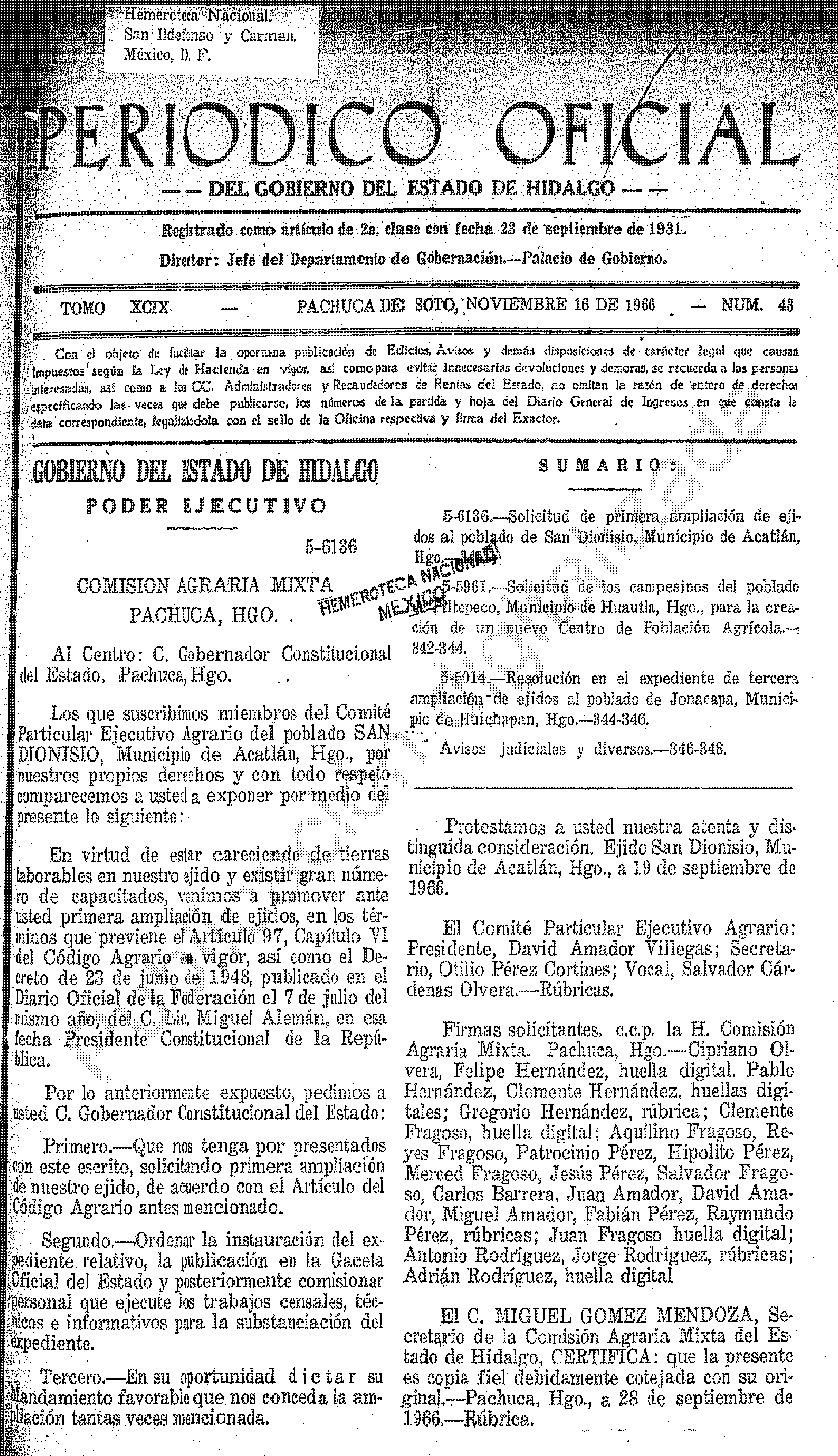 - 5-6136.- Solicitud de primera ampliación de ejidos al poblado de San Dionisio, Municipio de Acatlán, Hgo.