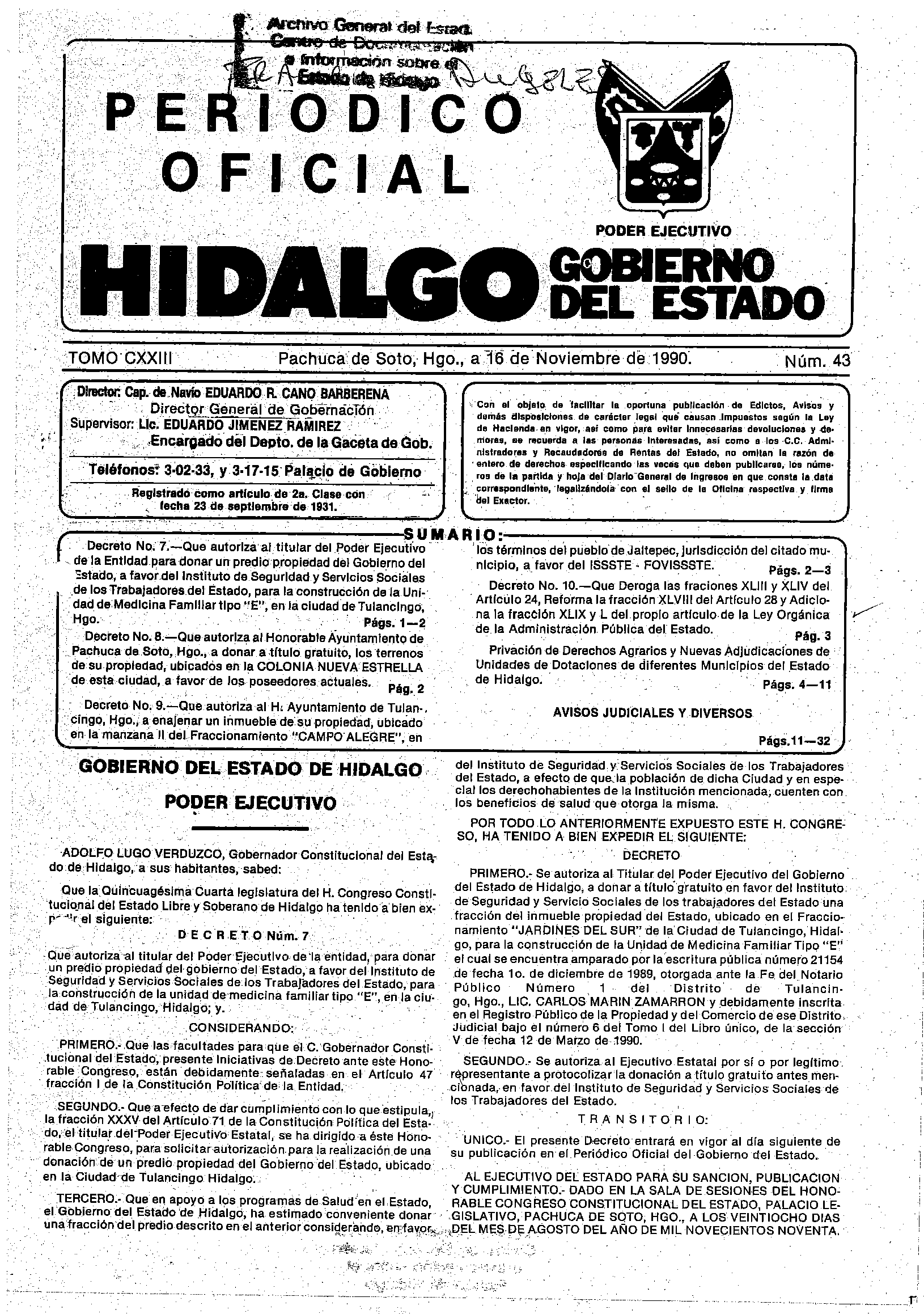 - Decreto No. 7.- Que autoriza al titular del Poder Ejecutivo de la Entidad para donar un predio propiedad del Gobierno del Estado, a favor del Instituto de Seguridad y Servicios Sociales de los Trabajadores del Estado, para la construcción de la Unidad de Medicina Familiar tipo “E”, en la ciudad de Tulancingo, Hgo.