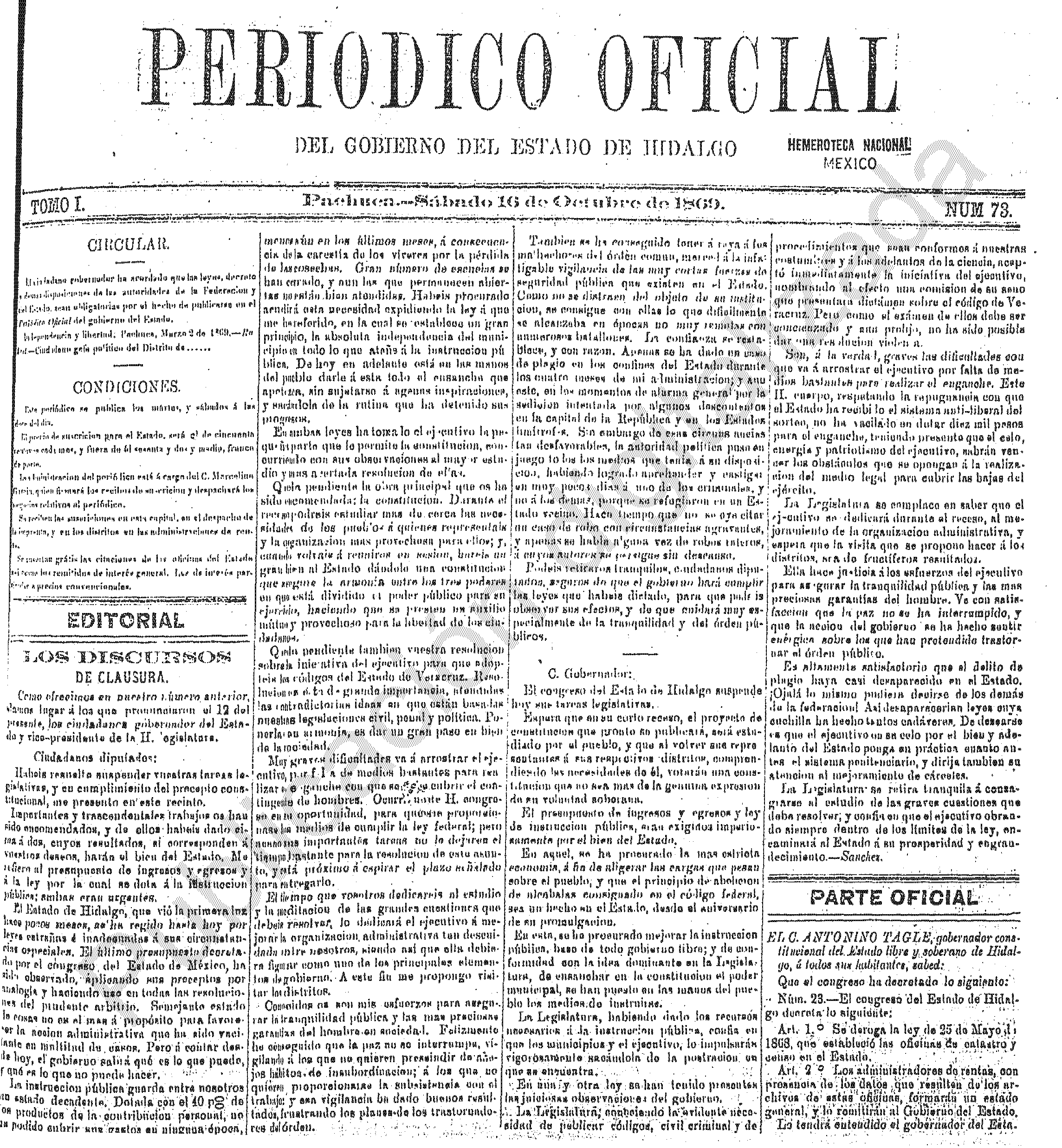 Descargar Periódico Oficial Ordinario 0 del 16 de octubre de 1869El portal web del Periódico Oficial del Estado de hidalgo es el único medio de difusión oficial del Gobierno del Estado de Hidalgo