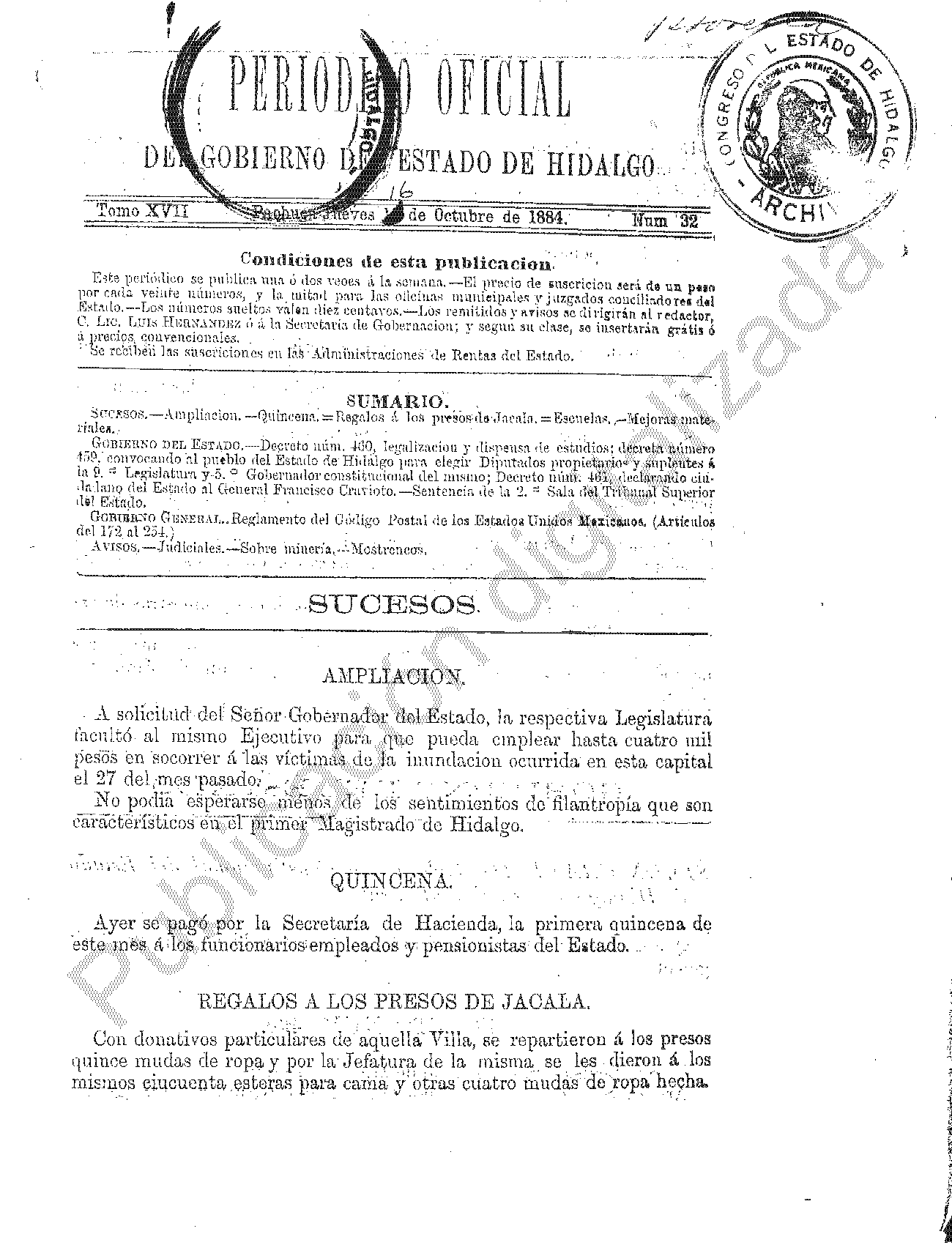 Descargar Periódico Oficial Ordinario 0 del 16 de octubre de 1884El portal web del Periódico Oficial del Estado de hidalgo es el único medio de difusión oficial del Gobierno del Estado de Hidalgo