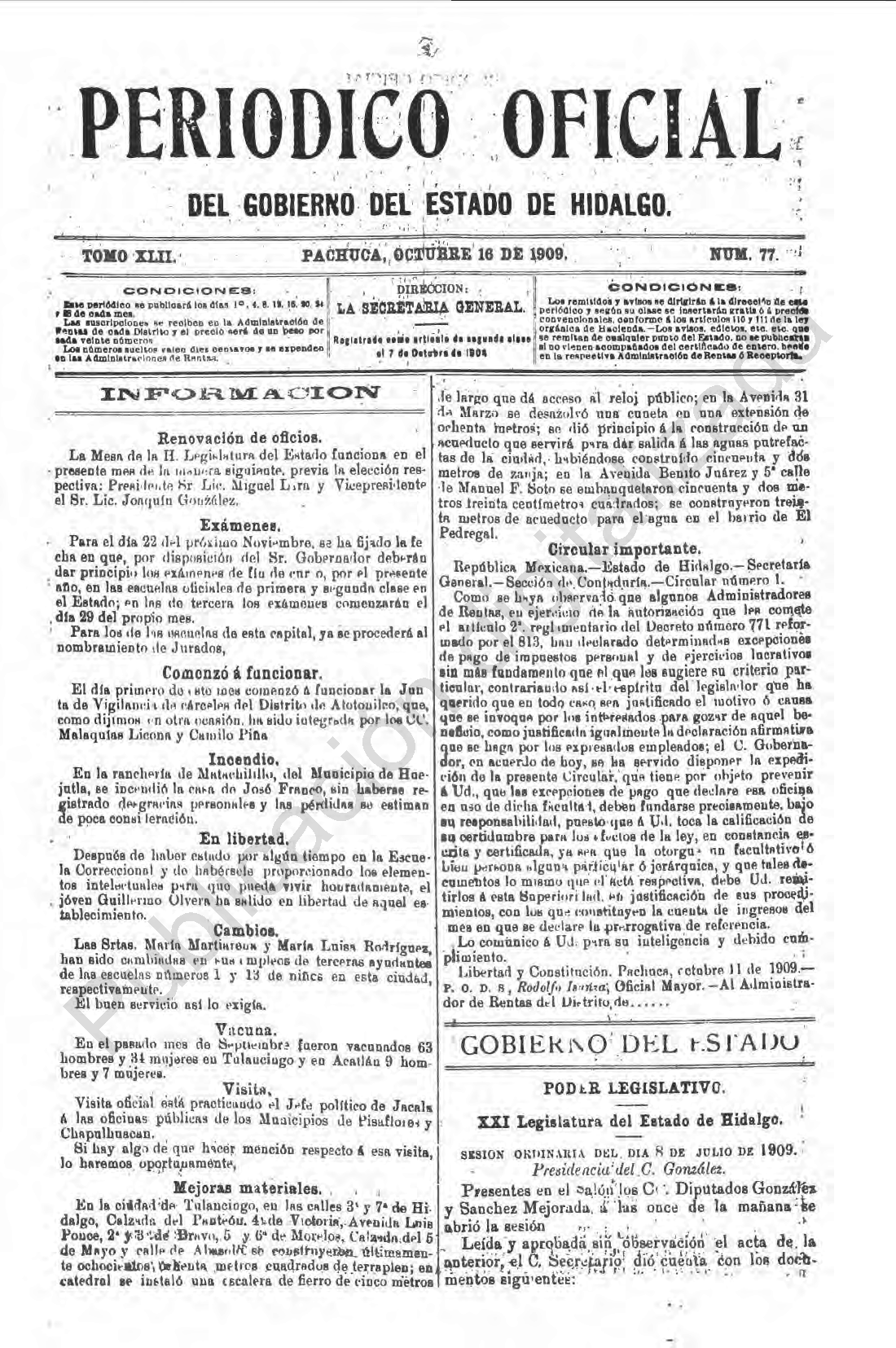 Periódico Oficial Ordinario 0 del 16 de octubre de 1909
