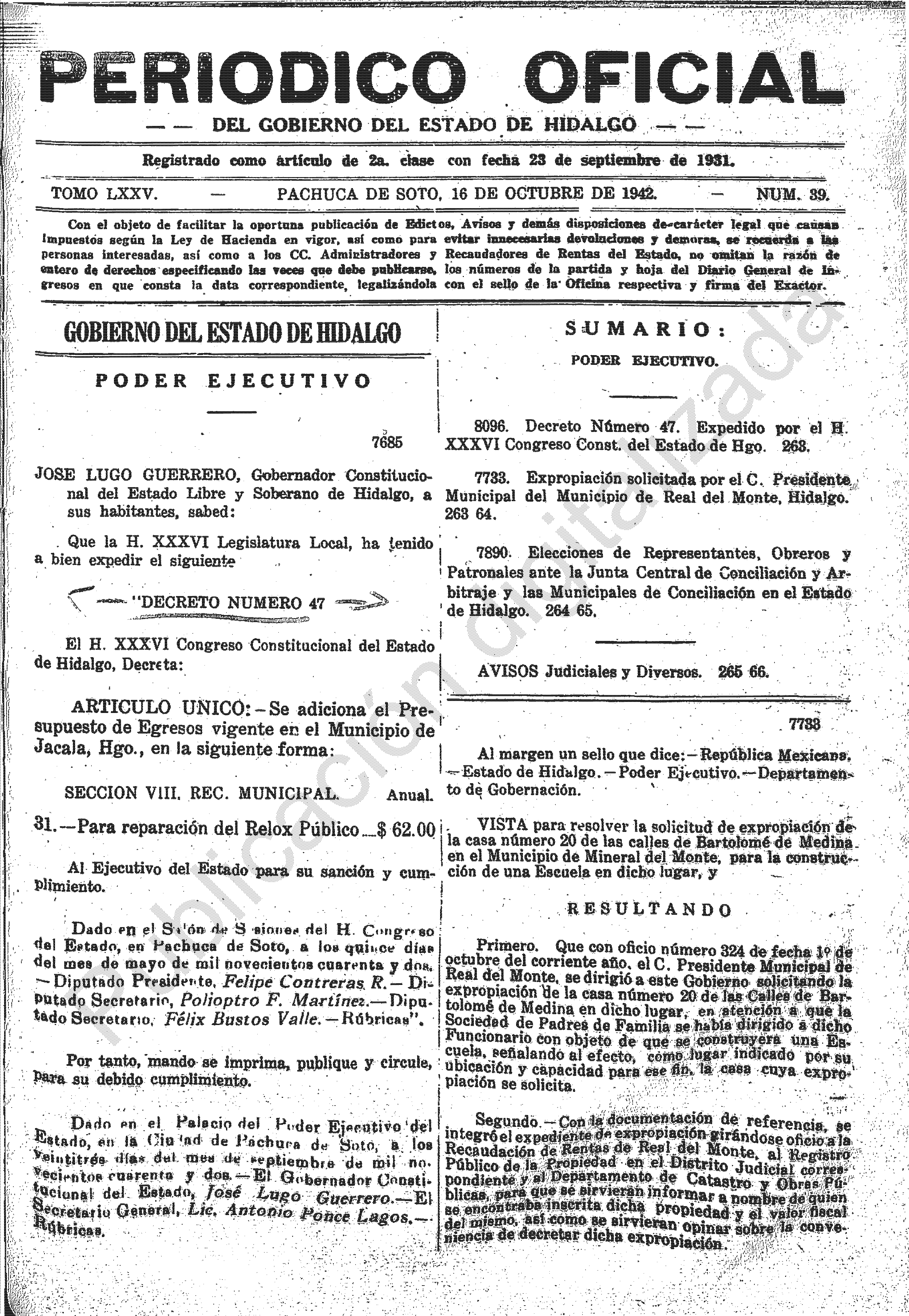 • 8096.- Decreto Número 47, expedido por el H. XXXVI Congreso Const. del Estado de Hgo.